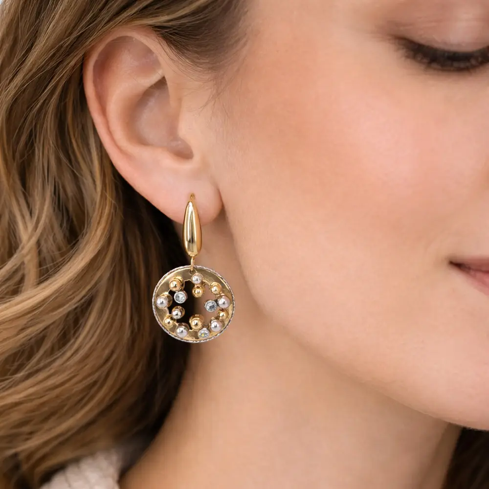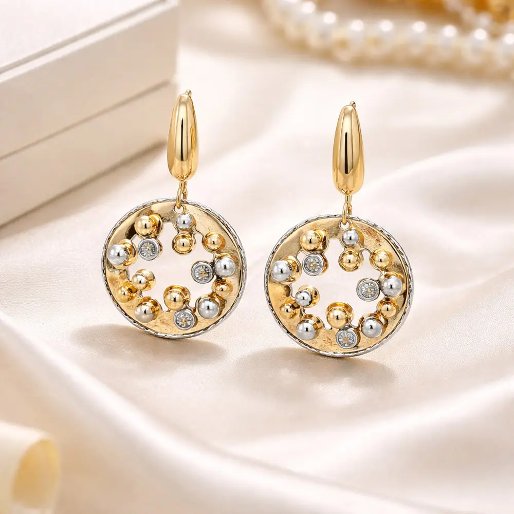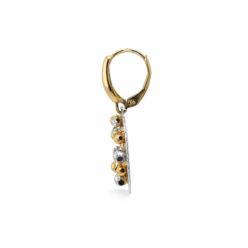 Diese hängenden Ohrringe aus kombiniertem Gold begeistern durch ein originelles rundes Motiv, in dem sich Gelb- und Weißgoldtöne harmonisch verbinden. Die strukturierte Oberfläche der Scheibe wird durch plastische Kugelverzierungen und feine funkelnde Details ergänzt, die dem Schmuck Tiefe und Eleganz verleihen.