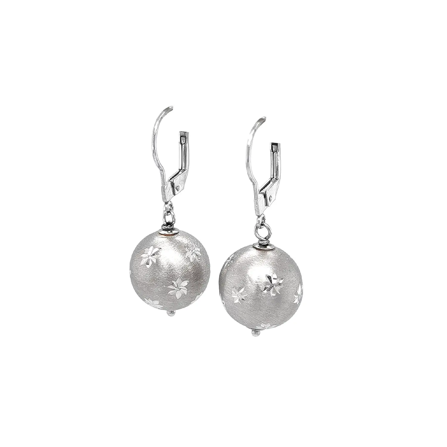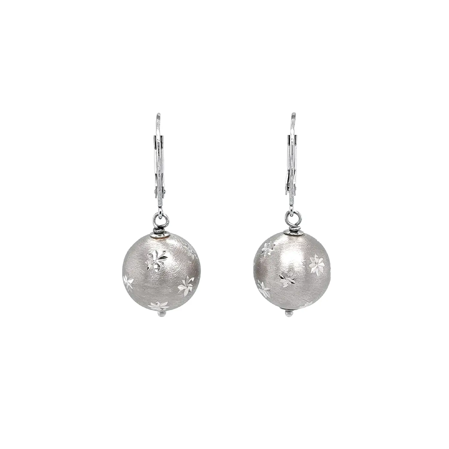 Diese hängenden Ohrringe aus Weißgold mit Kugelmotiv bestechen durch ihre fein strukturierte Oberfläche und dekorative Gravuren in Form kleiner Sterne. Die matte Optik in Kombination mit glänzenden Details erzeugt einen eleganten Kontrast und verleiht dem Schmuckstück eine leichte, festliche Ausstrahlung.