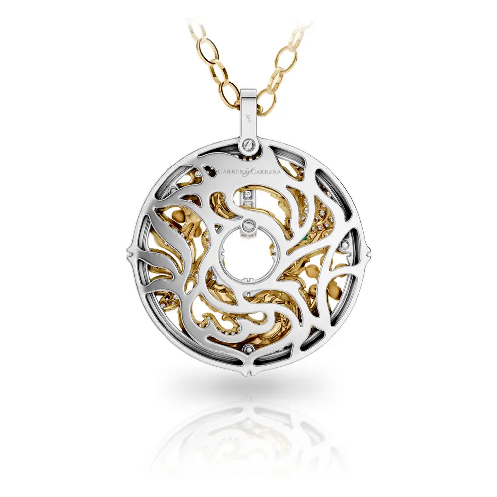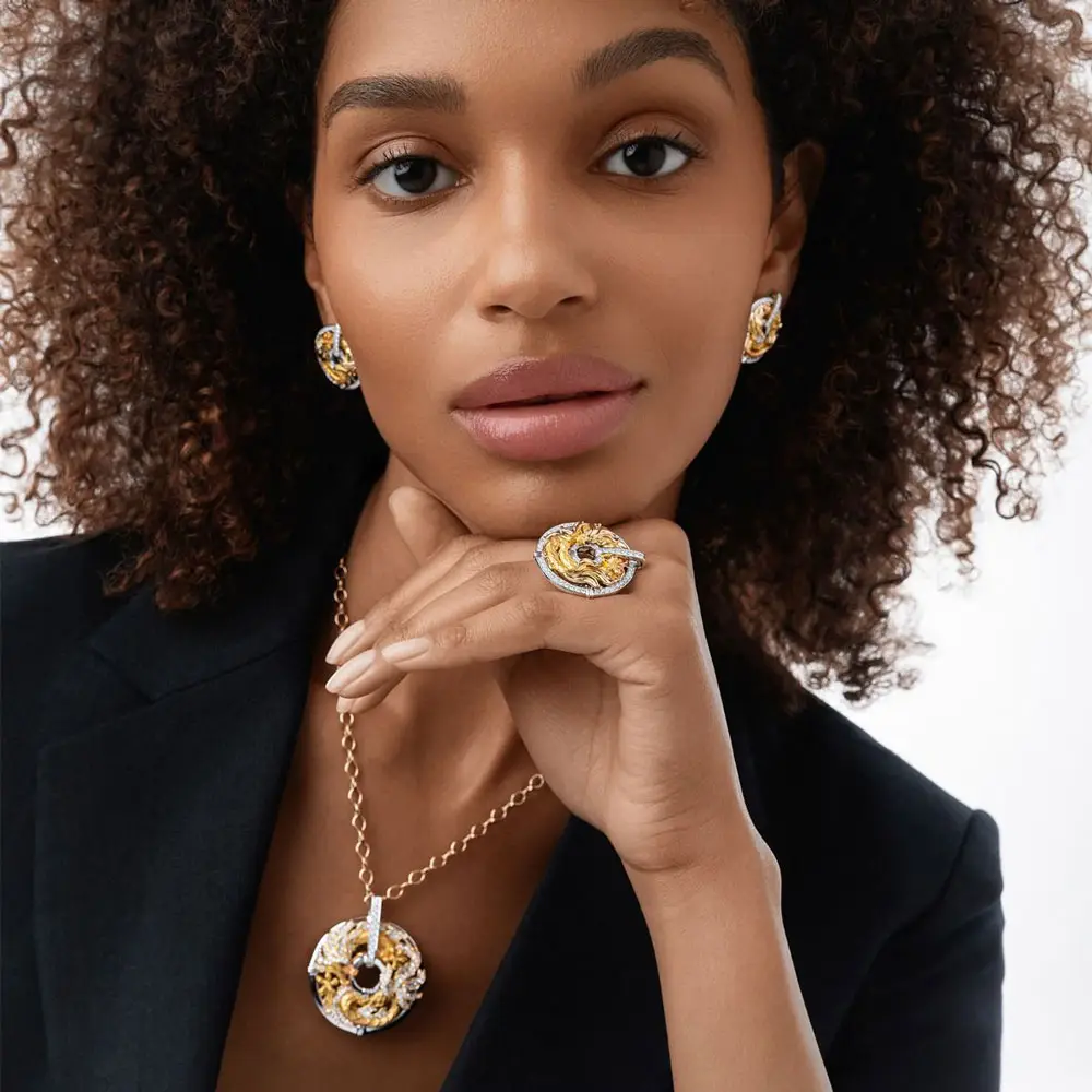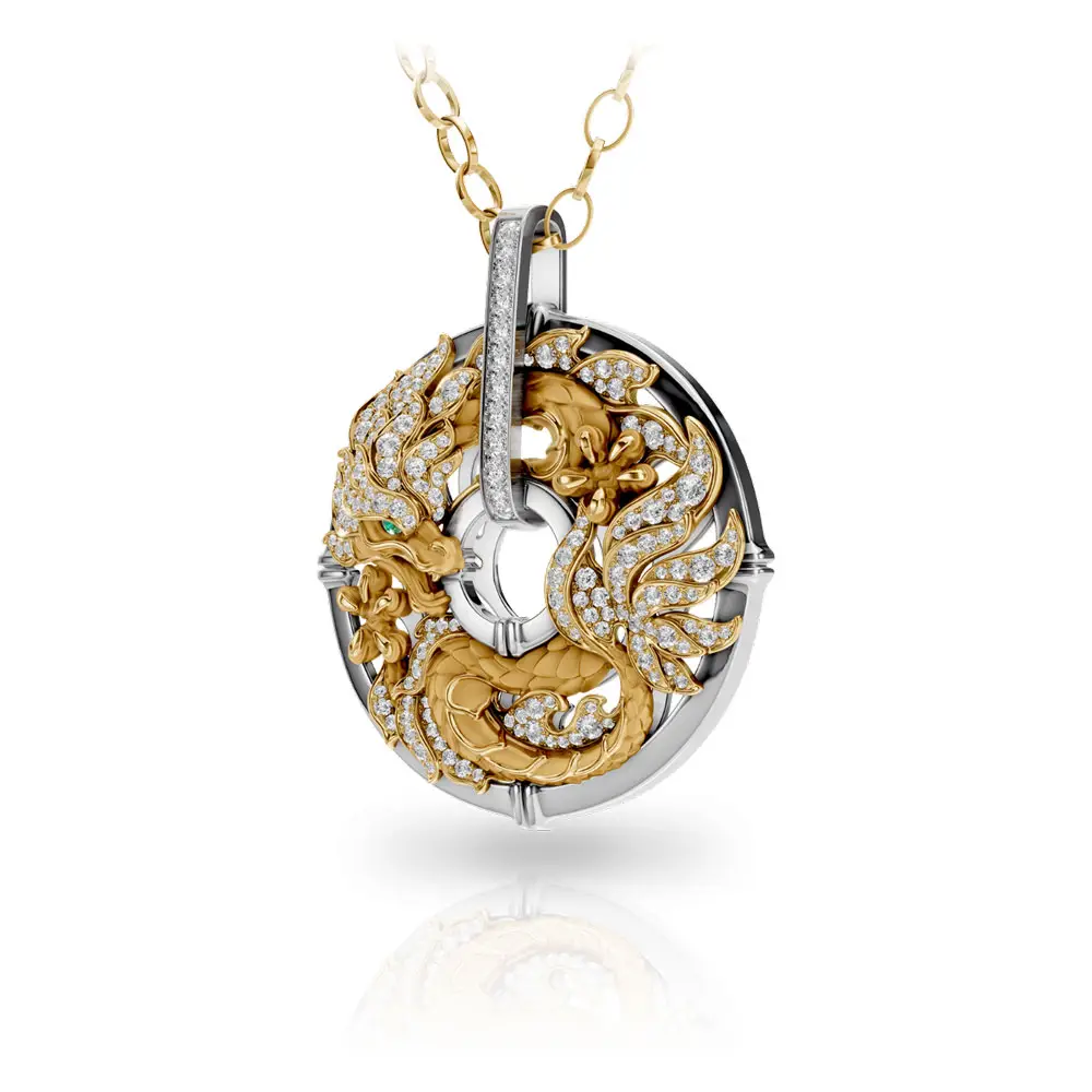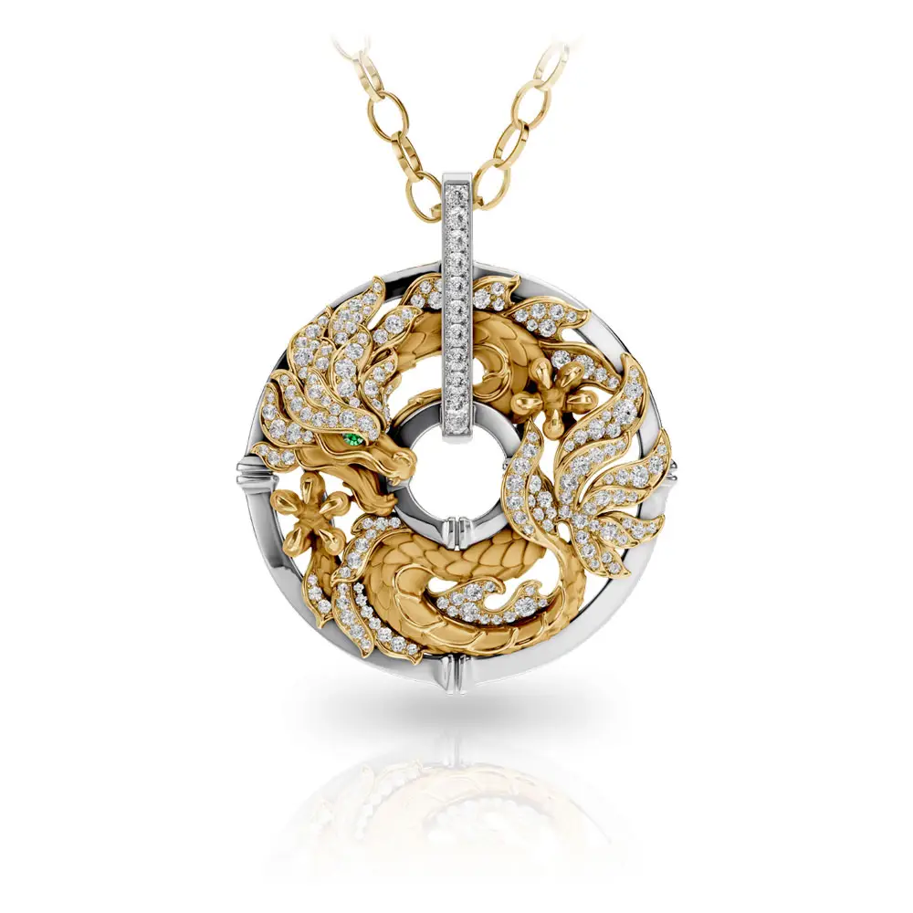 Carrera y Carrera ;New Shanghai Maxi Pavé ist ein außergewöhnliches Collier, das spanische Schmuckkunst mit der mystischen Kraft der orientalischen Symbolik verbindet. Das dominante Drachenmotiv aus 18-karätigem Gelb- und Weißgold ist mit 168 Pavé-Diamanten mit einem Gesamtgewicht von 1,76 Karat besetzt . Ein besonderes Detail ist ein grüner Diamant von 0,03 Karat, der das Auge des Drachens bildet und dem Schmuckstück Intensität und Tiefe verleiht.