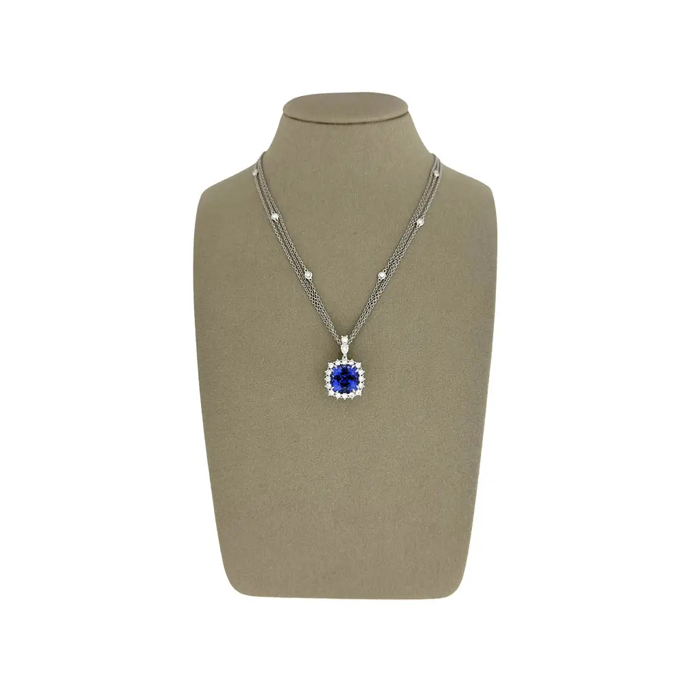 Im Zentrum des Schmuckstücks befindet sich ein natürlicher Tansanit mit einem Gewicht von 6,52 ct, im Cushion-Schliff (10,30 × 10,30 mm), dessen tiefblauer Farbton Ruhe und Tiefe ausstrahlt. Umgeben wird der Edelstein von 24 natürlichen weißen Diamanten mit einem Gesamtgewicht von 1,12 ct, Farbe G, Reinheit VS, die einen funkelnden Halo-Effekt schaffen.