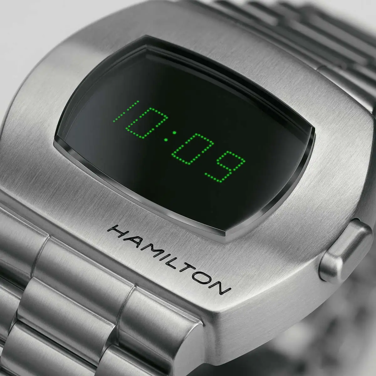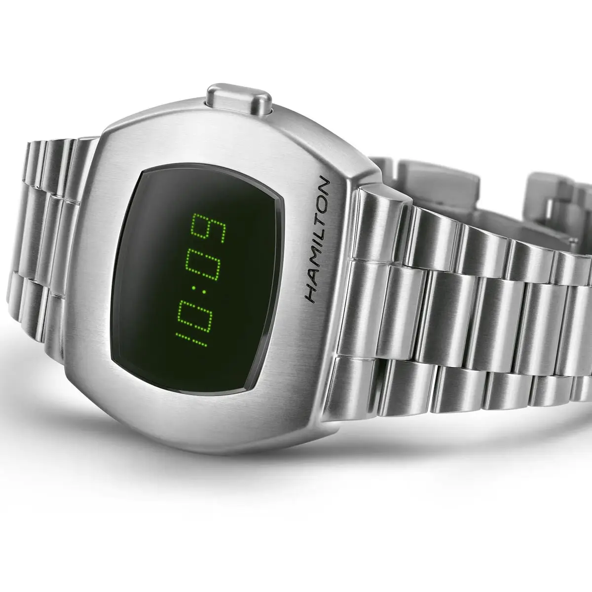 Die Hamilton American Classic PSR Digital Quartz H52414131 bringt das legendäre digitale Uhrendesign der 1970er Jahre zurück – jetzt mit moderner Technologie und Schweizer Präzision. Das 40,8 × 34,7 mm große Gehäuse aus Edelstahl hat eine charakteristische eckige Form, die an die ursprüngliche Pulsar erinnert – die erste digitale Uhr der Welt.