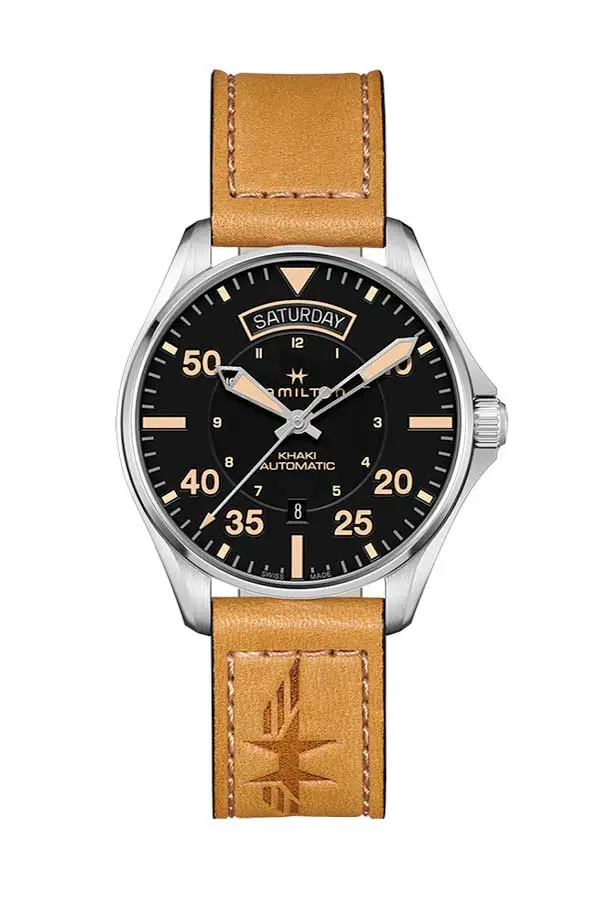 Kein Bewunderer des Militärs und der Luftfahrt sollte ohne eine Hamilton Herrenuhr an seinem Handgelenk sein. Die Khaki Aviation Day Date Automatic H64645531 besticht durch ihr farbenfrohes Design, das von einem braunen Lederarmband mit Verzierungen und einem schwarzen Zifferblatt mit kontrastierenden beigen Elementen dominiert wird. Die Datumsanzeige und die Wochentagsanzeige finden ihren Platz auf dem Zifferblatt mit seiner dezenten schmalen Lünette.