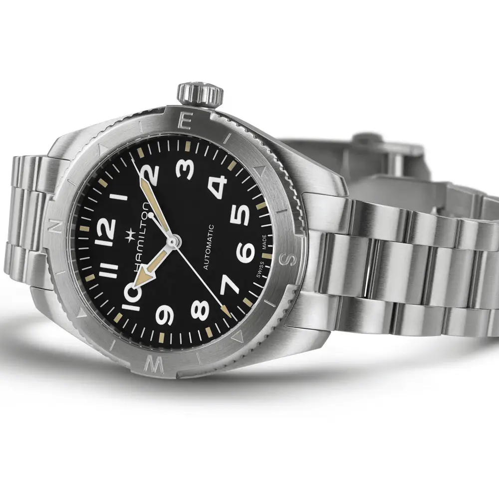 Die unverwechselbare Khaki Field Uhr verfügt über ein klares Zifferblatt mit kräftigen arabischen Ziffern, einer 24-Stunden-Skala und Leuchtzeigern. Sie werden in verschiedenen Größen und Ausführungen angeboten - von mechanischen Modellen mit Handaufzug über Automatikversionen bis hin zu Quarzvarianten. Die Gehäuse sind häufig aus mattiertem Stahl gefertigt und werden durch Textil-, Leder- oder Stahlarmbänder ergänzt, die dem täglichen Verschleiß standhalten.