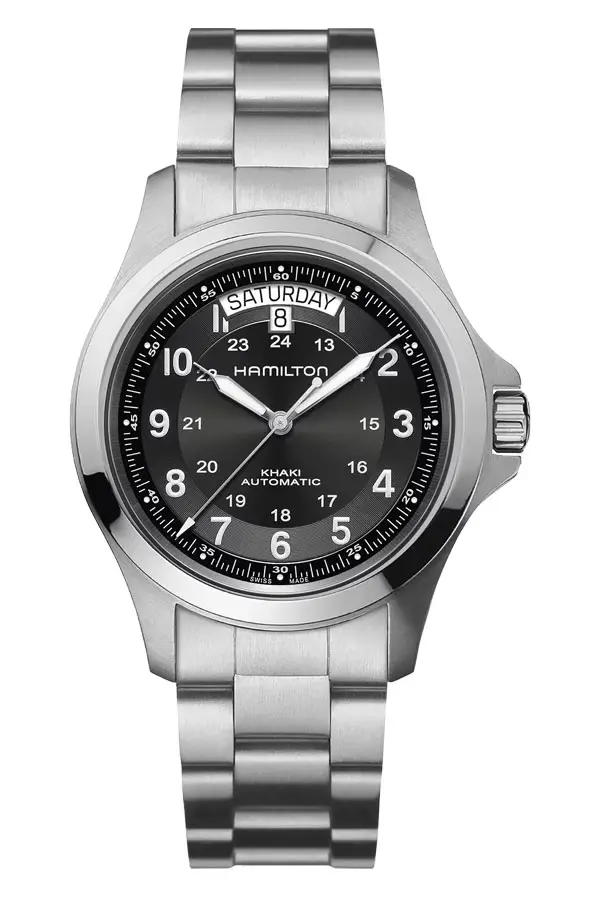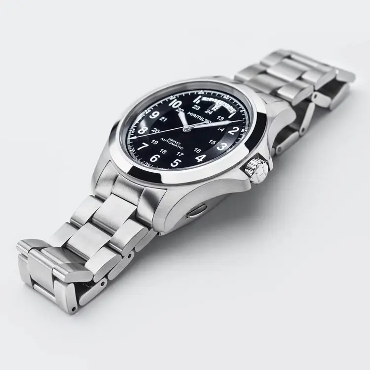 Die unverwechselbare Khaki Field Uhr verfügt über ein klares Zifferblatt mit kräftigen arabischen Ziffern, einer 24-Stunden-Skala und Leuchtzeigern. Sie werden in verschiedenen Größen und Ausführungen angeboten - von mechanischen Modellen mit Handaufzug über Automatikversionen bis hin zu Quarzvarianten. Die Gehäuse sind häufig aus mattiertem Stahl gefertigt und werden durch Textil-, Leder- oder Stahlarmbänder ergänzt, die dem täglichen Verschleiß standhalten.