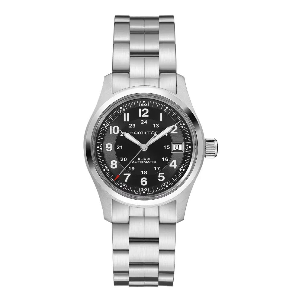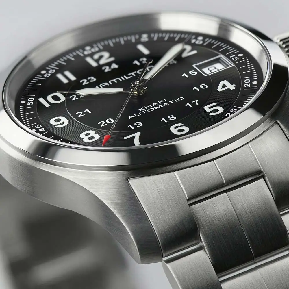 Die unverwechselbare Khaki Field Uhr verfügt über ein klares Zifferblatt mit kräftigen arabischen Ziffern, einer 24-Stunden-Skala und Leuchtzeigern. Sie werden in verschiedenen Größen und Ausführungen angeboten - von mechanischen Modellen mit Handaufzug über Automatikversionen bis hin zu Quarzvarianten. Die Gehäuse sind häufig aus mattiertem Stahl gefertigt und werden durch Textil-, Leder- oder Stahlarmbänder ergänzt, die dem täglichen Verschleiß standhalten.