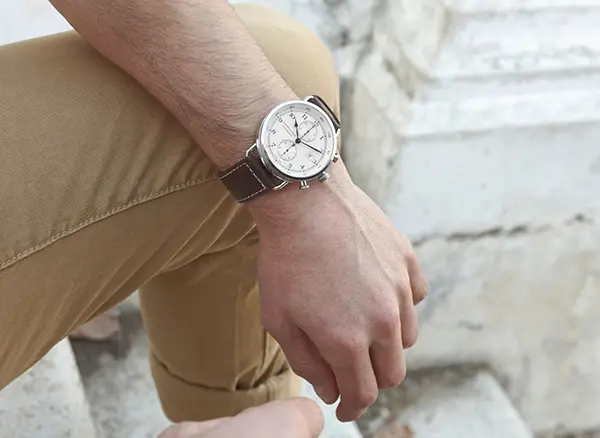 Das elegante weiße analoge Zifferblatt bietet eine übersichtliche Zeitanzeige sowie eine Chronographenfunktion und ein Datumsfenster, ideal für Männer mit Sinn für Details. Das braune Lederarmband mit Dornschließe sorgt für angenehmen und sicheren Tragekomfort.