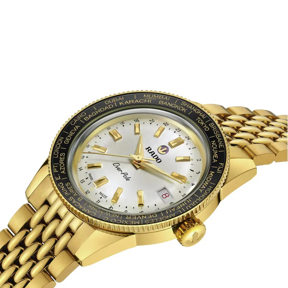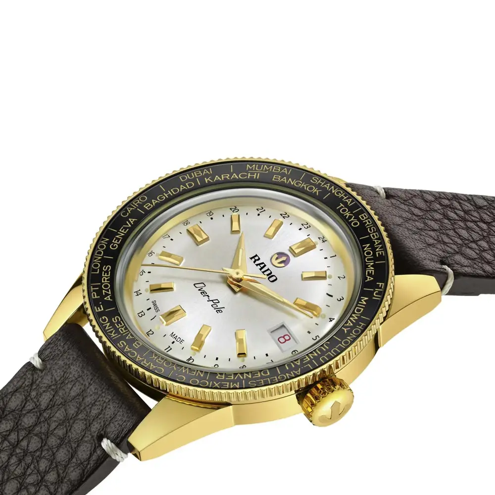 Die limitierte Edition Rado Captain Cook Over-Pole R32193018 ist eine Hommage an den Abenteuergeist und das Erbe der Entdeckungen von Rado. Dieses außergewöhnliche Modell vereint retro-inspirierte Ästhetik mit moderner Uhrmacherkunst. Das runde 39 mm Gehäuse besteht aus Edelstahl mit gelbgoldener PVD-Beschichtung, was der Uhr eine edle Note verleiht. Das silberne Zifferblatt wird von einer Keramiklünette mit Gravur von Weltstädten ergänzt.