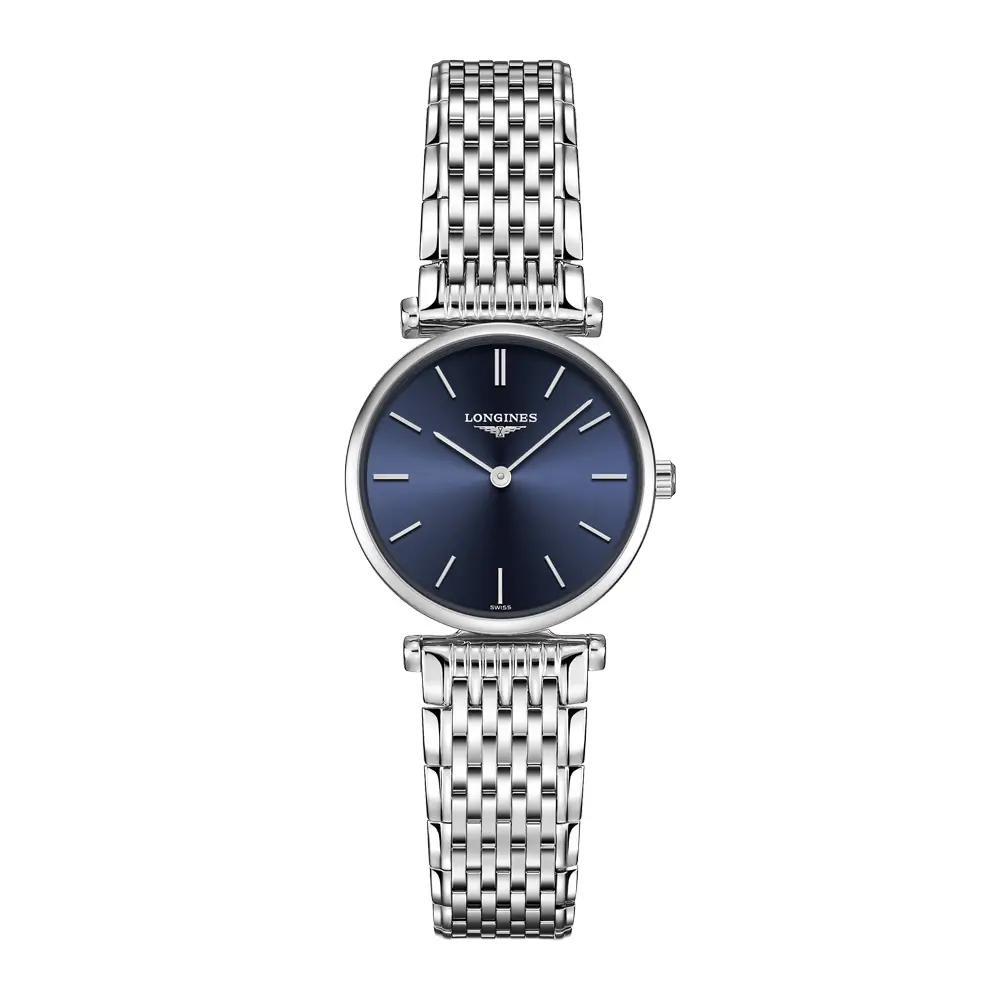 Longines La Grande Classique L4.209.4.95.6 ist eine Damen-Quarzuhr, die Eleganz und Minimalismus perfekt verkörpert. Das schlanke 24 mm Edelstahlgehäuse ist mit kratzfestem Saphirglas ausgestattet.