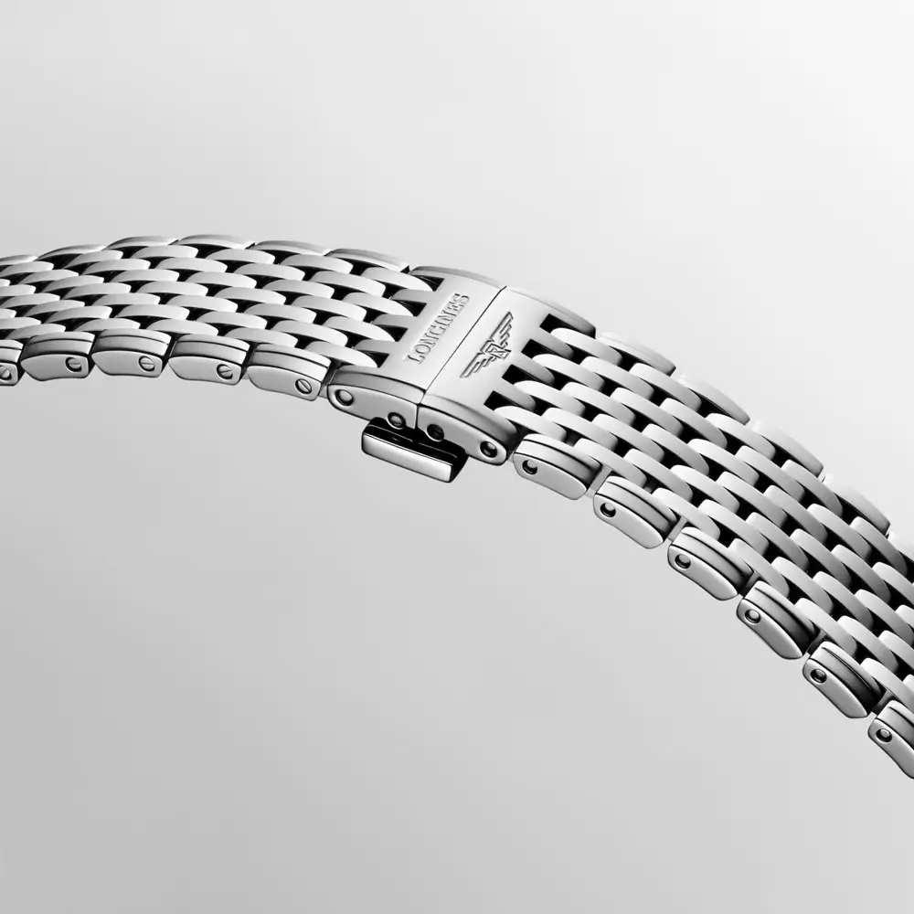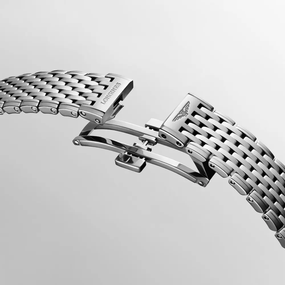 Im Inneren arbeitet das präzise Schweizer Quarzkaliber L420, das höchste Genauigkeit und mühelose Nutzung garantiert. Abgerundet wird die Uhr durch ein Edelstahlarmband mit dreifacher Sicherheitsfaltschließe, das Eleganz und maximalen Komfort verbindet. Eine perfekte Symbiose aus Tradition, femininer Anmut und feiner Uhrmacherkunst von Longines.