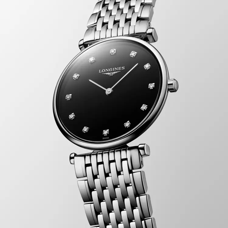 Auf dem markanten schwarzen lackierten Zifferblatt erstrahlen 12 Diamantindizes (0,081 ct) und verleihen dem Modell noblen Glanz und luxuriösen Charme. Schlanke Stahlzeiger ergänzen das minimalistische Design und unterstreichen den zeitlosen Charakter der La Grande Classique-Kollektion.