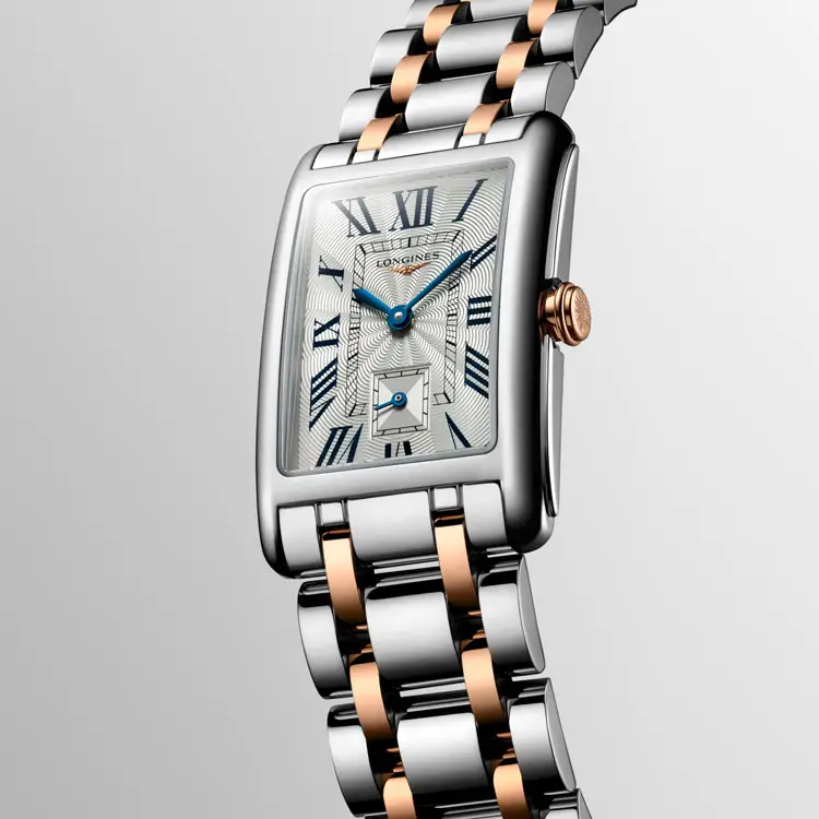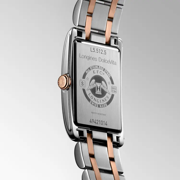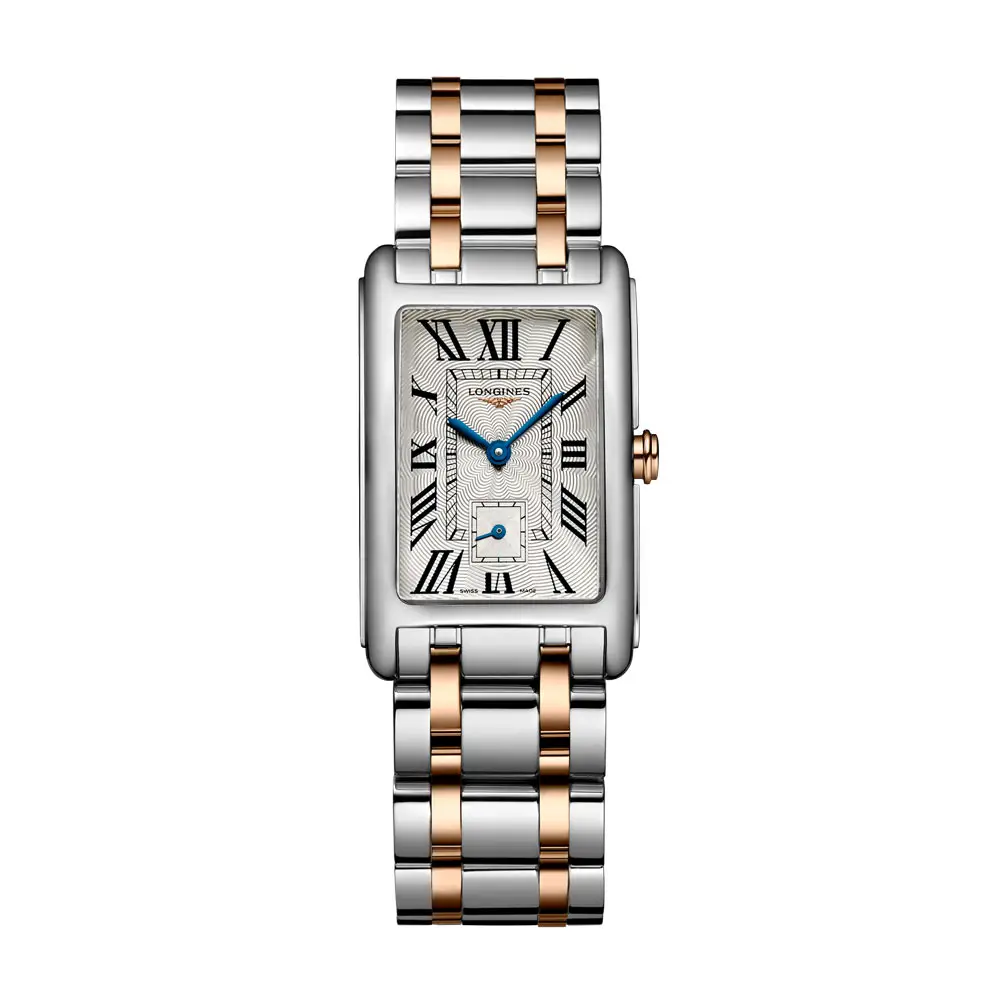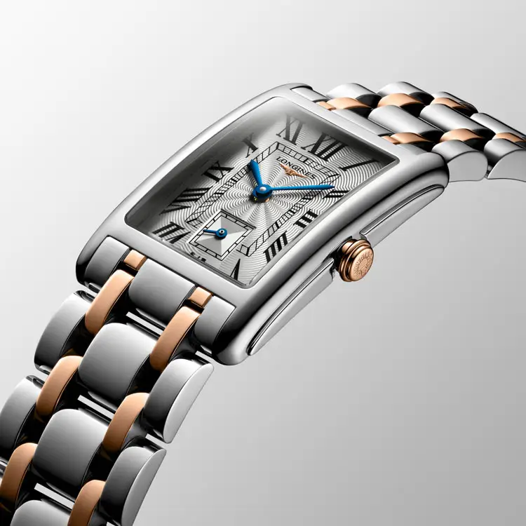Die Longines DolceVita L5.512.5.71.7 ist eine Damenuhr von zeitloser Eleganz, inspiriert vom klassischen rechteckigen Design. Das 23,30 × 37,00 mm Edelstahlgehäuse wird durch eine Krone aus 18 Karat Roségold ergänzt, die einen edlen Kontrast schafft.
