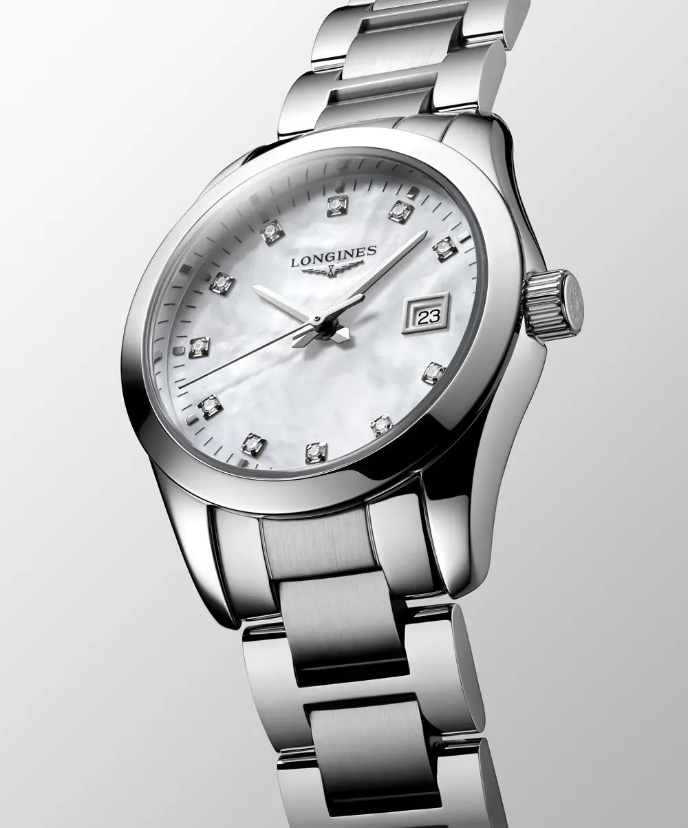 Das Edelstahlarmband kombiniert polierte und satinierte Oberflächen und ist mit einer dreifachen Sicherheitsfaltschließe mit Drückeröffnung ausgestattet, die Komfort und Sicherheit garantiert. Die Conquest Classic L2.286.4.87.6 ist perfekt für Frauen, die ein zeitloses und elegantes Accessoire mit dezentem Luxus suchen.