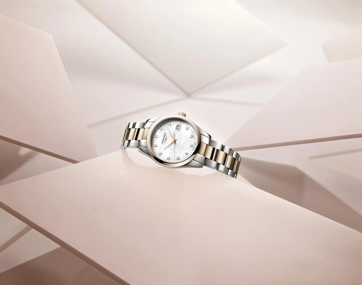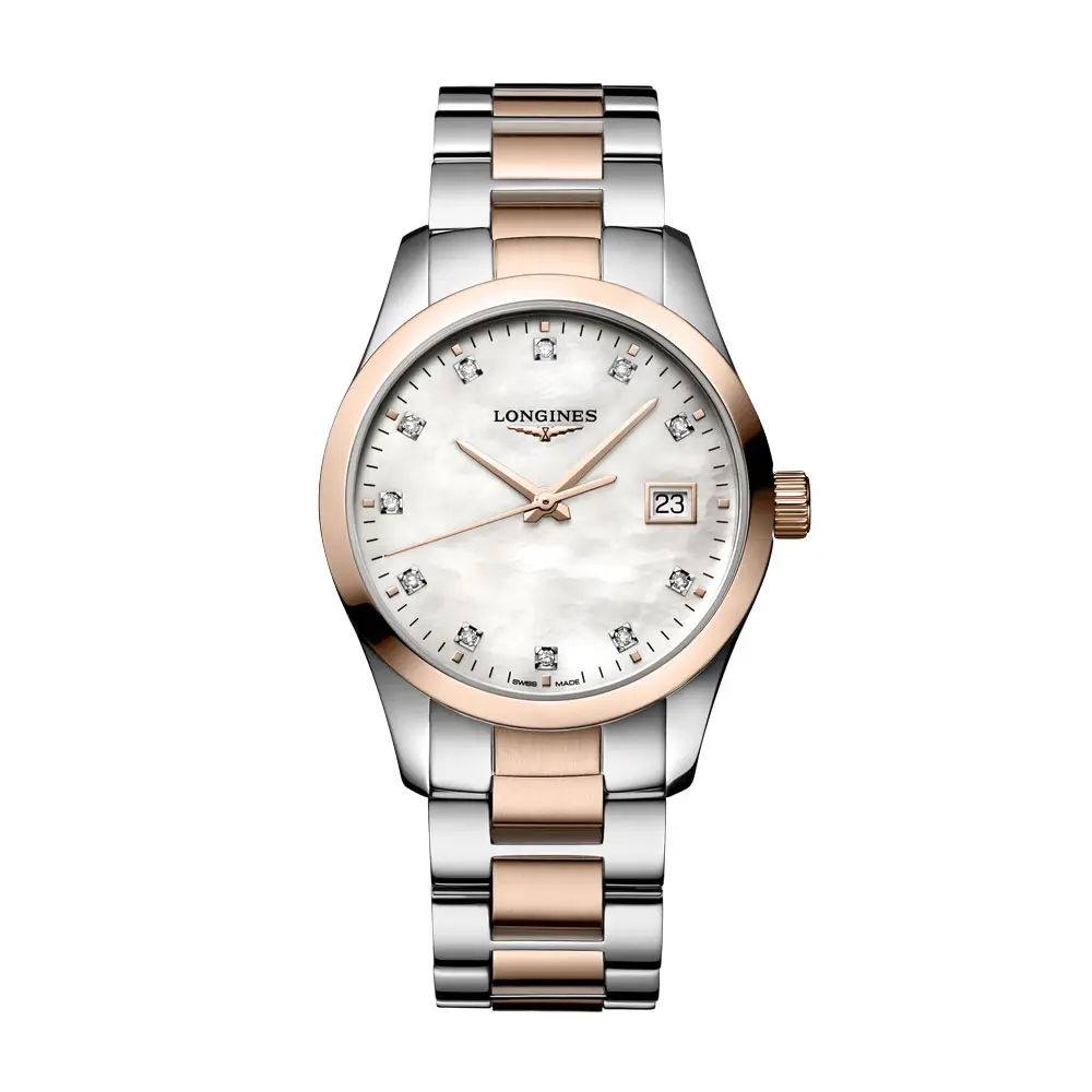 Die Longines Conquest Classic L2.386.3.87.7 ist eine elegante Damenversion der ikonischen Conquest-Kollektion, die Schmuckelemente mit Funktionalität verbindet. Das 34-mm-Edelstahlgehäuse mit dezentem rotem PVD-Finish umrahmt ein weißes Perlmuttzifferblatt, das mit 11 Diamantindizes besetzt ist. Bei 3 Uhr befindet sich ein diskretes Datumsfenster.