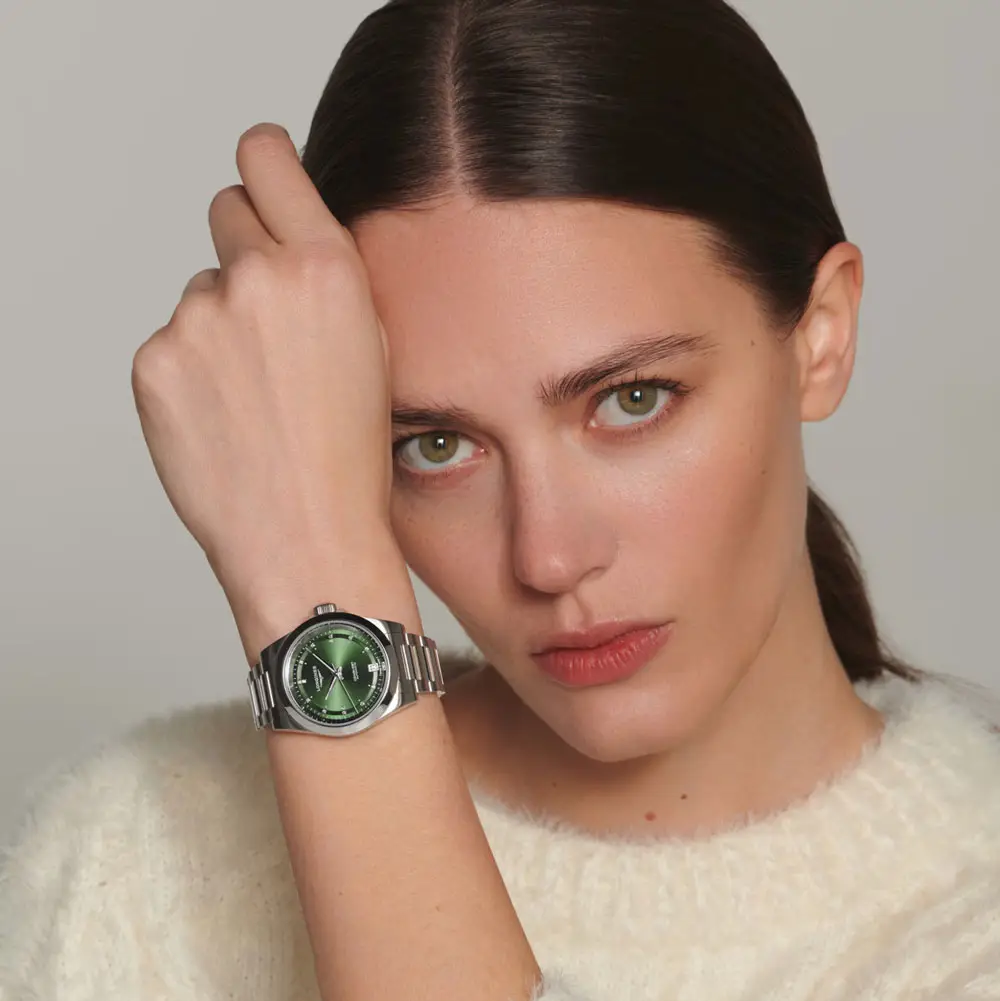 Das grüne Sunray-Zifferblatt erstrahlt mit 14 Diamantindizes (0,035 ct), ergänzt durch silberfarbene Leuchtzeiger. Ein praktisches Datumsfenster bei 6 Uhr sorgt für eine perfekte Balance zwischen Ästhetik und Funktionalität, während die frische Zifferblattfarbe dem Modell Originalität und Charakter verleiht.