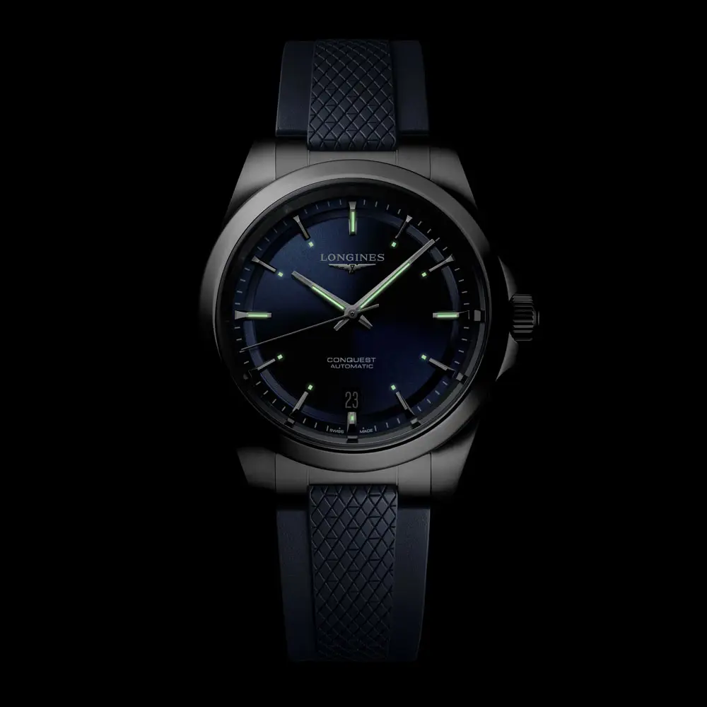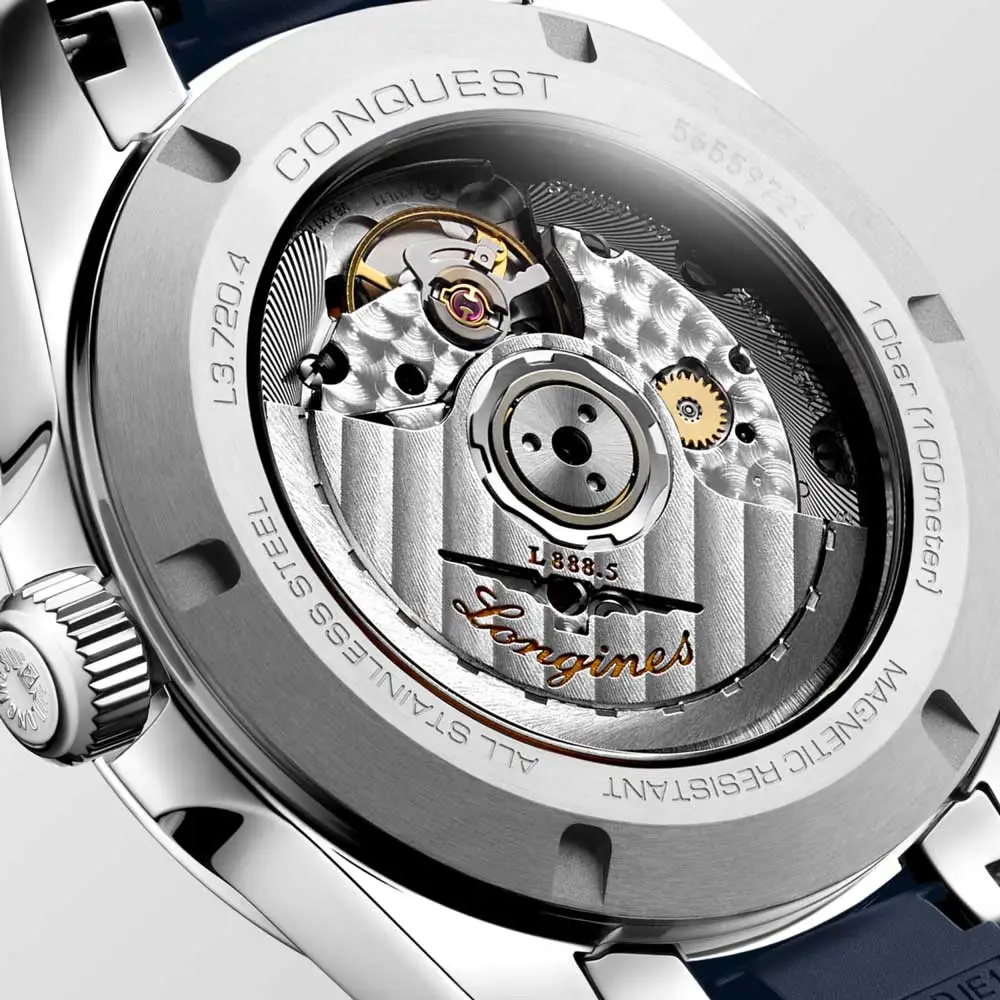 Im Innern der Uhr arbeitet das leistungsstarke Automatikwerk L888.5 mit einer Gangreserve von bis zu 72 Stunden, das mit einem Siliziumgewinde für eine höhere Widerstandsfähigkeit gegenüber Magnetfeldern ausgestattet ist. Die Uhr ist mit einem blauen Kautschukarmband mit Faltschließe und Mikroverstellsystem ausgestattet, das auch bei sportlichen Aktivitäten für Komfort sorgt. Die Longines Conquest bietet somit zuverlässige Leistung, zeitlosen Stil und Schweizer Präzision in einem.