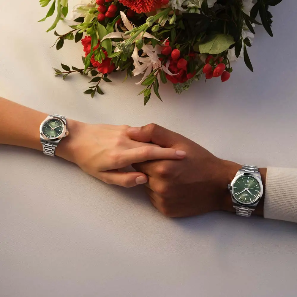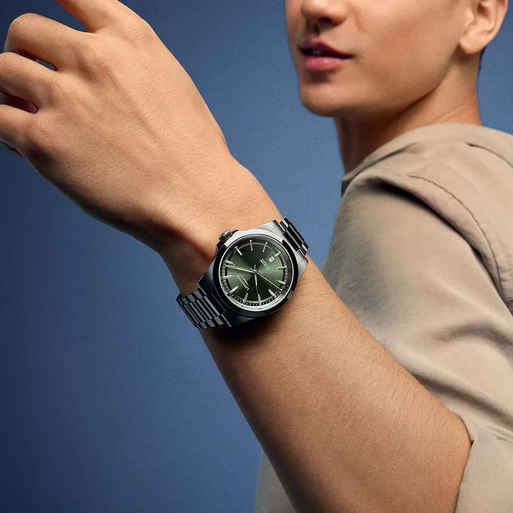 Das robuste runde Edelstahlgehäuse mit 41 mm Durchmesser wird von einer klar gestalteten Lünette ergänzt, während das grüne Zifferblatt mit Sonnenschliff durch Tiefe und Eleganz besticht. Die analoge Anzeige mit Datumsfenster bei 3 Uhr wird von einem kratzfesten Saphirglas mit Antireflexbeschichtung geschützt.