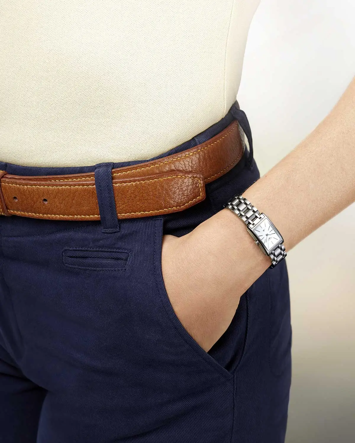 Die Longines DolceVita L5.255.4.11.6 ist eine elegante Damenuhr, die die Feinheit und das zeitlose Design der DolceVita-Kollektion vereint. Ihr 20,80 × 32,00 mm Edelstahlgehäuse umschließt ein weiß mattes Zifferblatt mit zarten Indizes und Zeigern, die den dezenten und raffinierten Stil betonen.