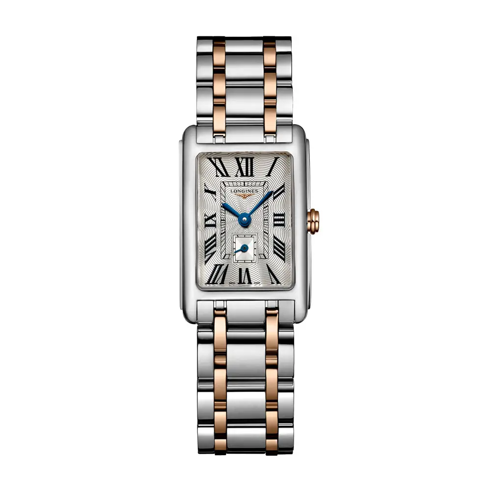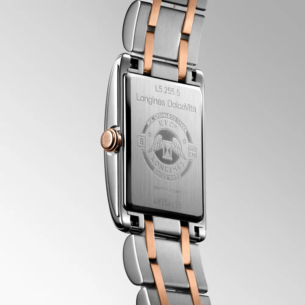 Die Longines DolceVita L5.255.5.71.7 ist eine Damenuhr im eleganten zweifarbigen Design, die die Feinheit der DolceVita-Kollektion mit zeitloser Ästhetik verbindet. Ihr 20,80 × 32,00 mm Edelstahlgehäuse wird durch eine Krone aus 18kt Roségold ergänzt, während das silberfarbene „Flinqué“-Zifferblatt mit römischen Ziffern und gebläuten Zeigern den klassischen Charakter der Uhr hervorhebt.