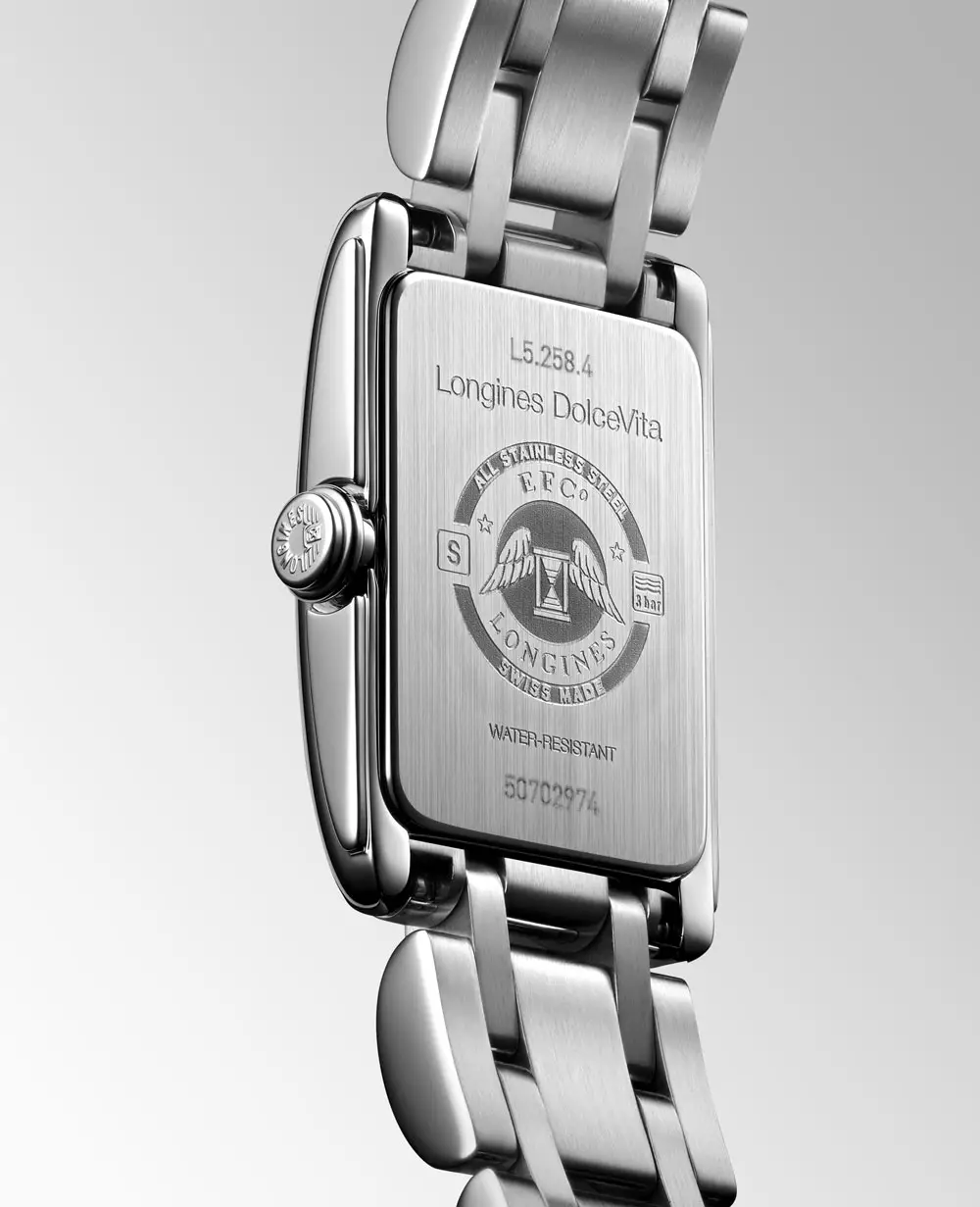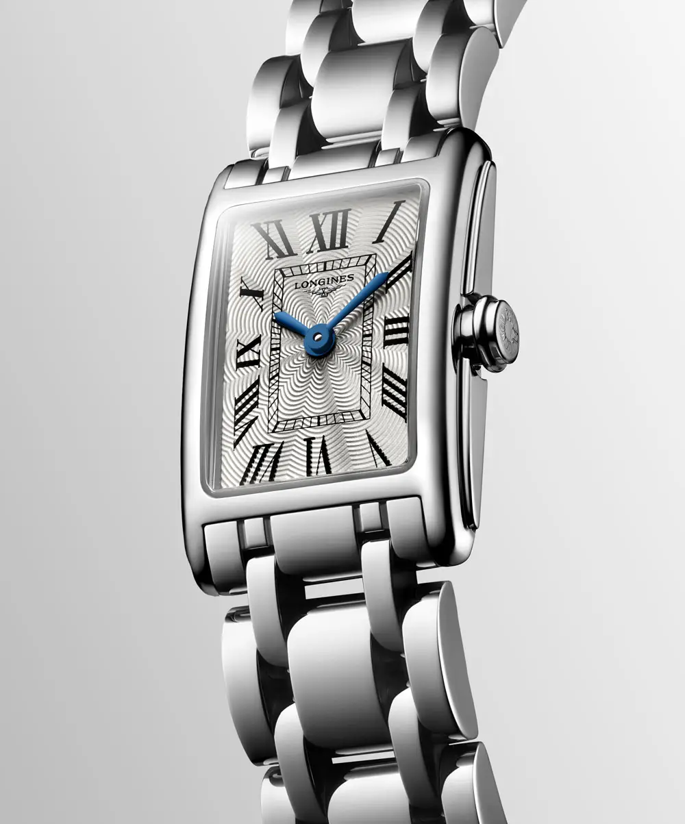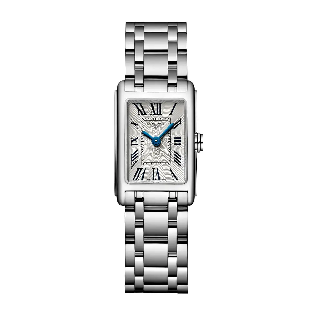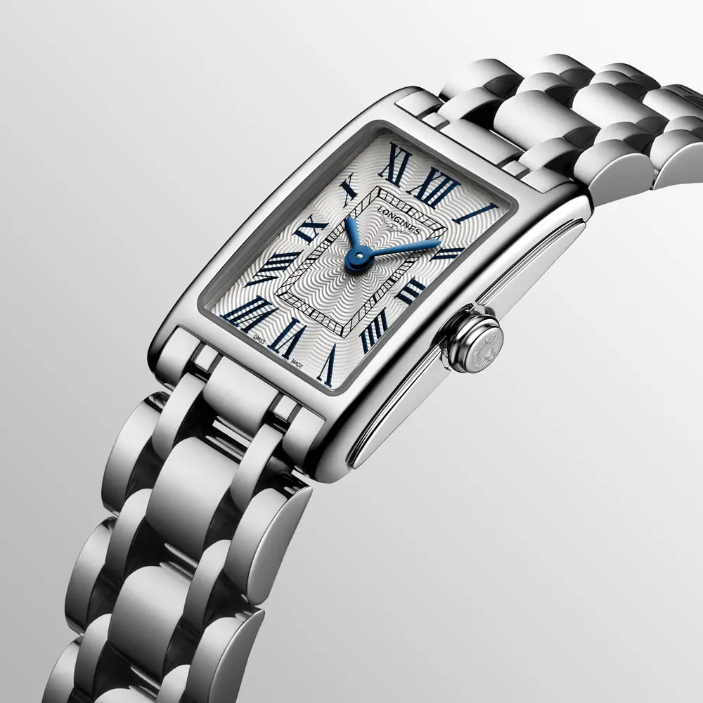Die Longines DolceVita L5.258.4.71.6 ist eine zarte Damenuhr, die die zeitlose Eleganz und den femininen Charme der DolceVita-Kollektion widerspiegelt. Ihr 17,70 × 27,00 mm Edelstahlgehäuse umrahmt ein silberfarbenes „Flinqué“-Zifferblatt mit römischen Ziffern und gebläuten Zeigern, die den klassischen Charakter unterstreichen.