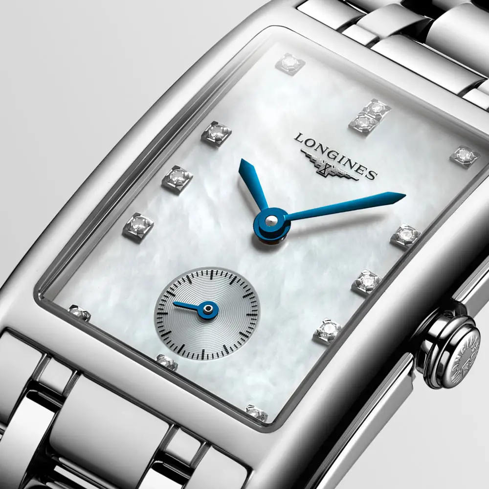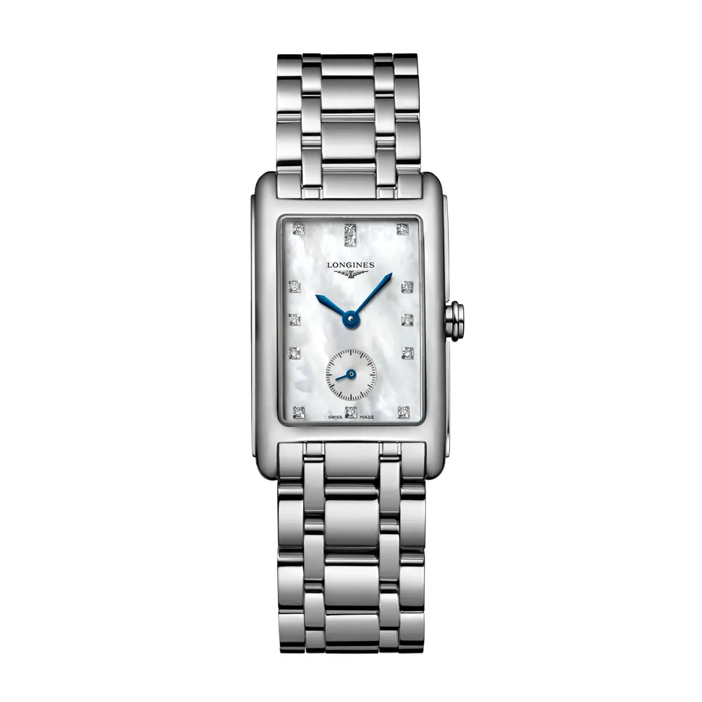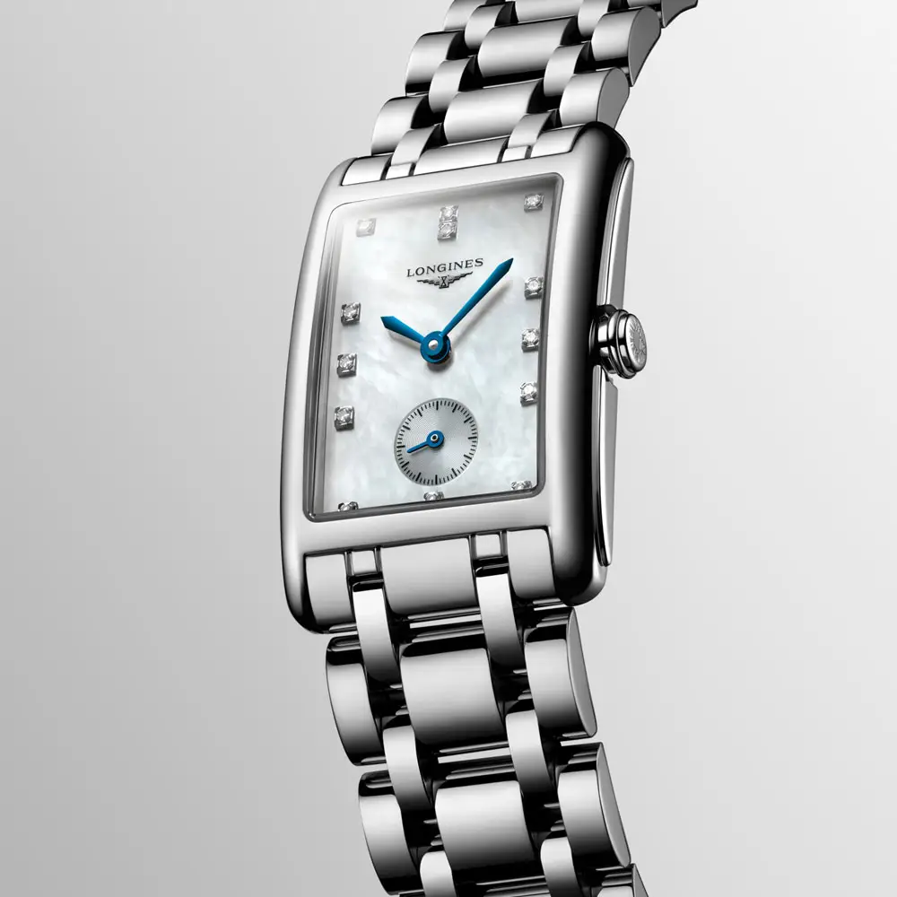 Die Longines DolceVita L5.512.4.87.6 ist eine elegante Damenuhr, die die klassischen Formen der DolceVita-Kollektion mit einem modernen Hauch verbindet. Ihr 23,30 × 37,00 mm Edelstahlgehäuse umschließt ein Zifferblatt mit dezenten Details, die den raffinierten Charakter der Uhr unterstreichen.