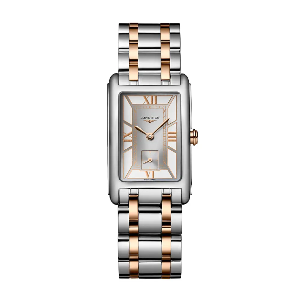 Die Longines DolceVita L5.512.5.75.7 ist eine Damenuhr, die die Eleganz der DolceVita-Kollektion mit einem raffinierten zweifarbigen Design verbindet. Ihr 23,30 × 37,00 mm Edelstahlgehäuse wird durch eine Krone aus 18kt Roségold ergänzt, während das weiße Zifferblatt mit römischen Ziffern und einer kleinen Sekunde bei 6 Uhr den klassischen Charakter der Uhr betont.