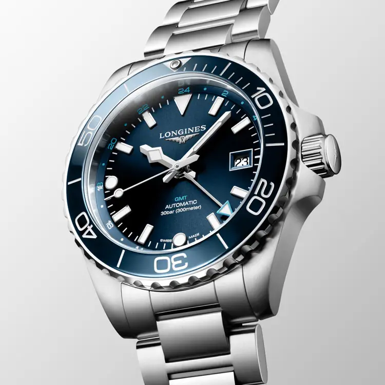 Die Longines HydroConquest GMT L3.790.4.96.6 erweitert die ikonische HydroConquest-Kollektion um eine neue Funktion – GMT. Das 41 mm große Edelstahlgehäuse wird von einer blauen Keramiklünette und einem Zifferblatt mit Sunray-Finish ergänzt. Dank leuchtender Zeiger und Indizes ist die Uhr auch bei schlechten Lichtverhältnissen hervorragend ablesbar.
