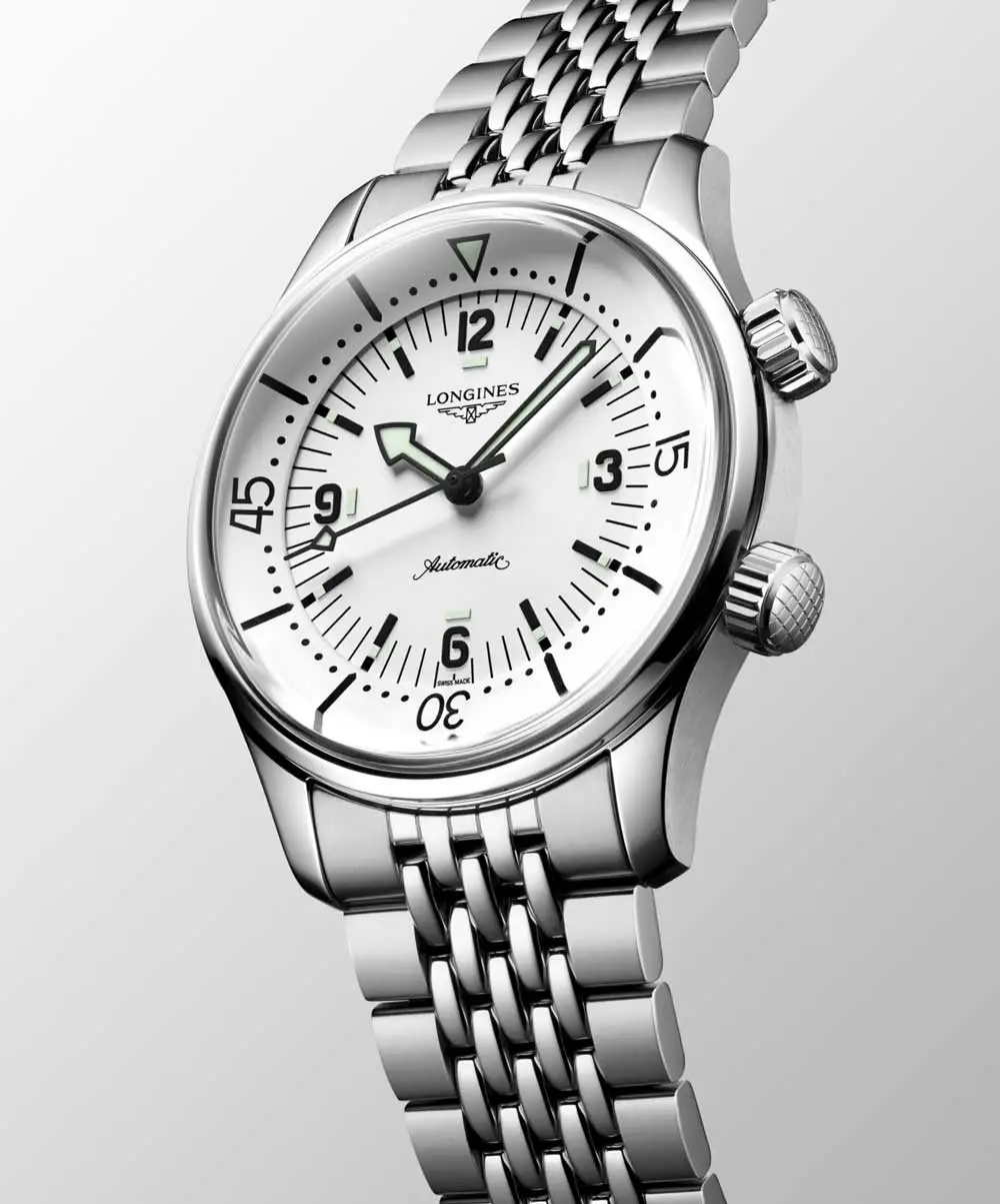Die Longines Legend Diver 39 mm bringt das ikonische Taucherdesign in ein kompaktes Format mit einem modernen Touch. Das 39-mm-Edelstahlgehäuse behält die charakteristische Form dieser historischen Kollektion bei und wird durch eine innenliegende, drehbare Lünette ergänzt, die von einer zweiten Krone bedient wird. Das weiße, matte Zifferblatt kontrastiert mit den schwarzen Indizes und Zeigern, die mit Super-LumiNova® beschichtet sind und so auch im Dunkeln hervorragend ablesbar sind.