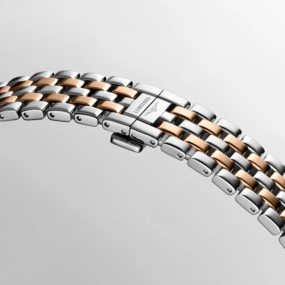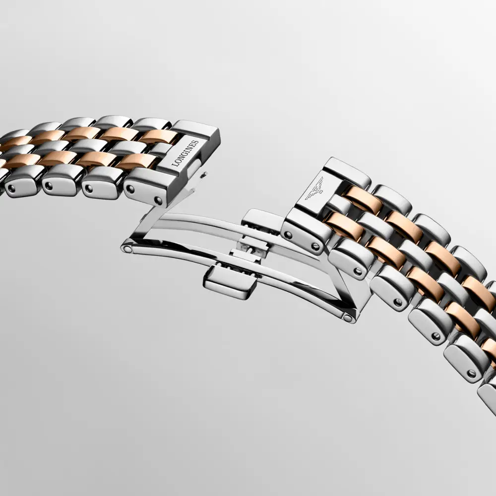 Angetrieben wird die Uhr von einem Quarzwerk, Kaliber L178, das für präzise und zuverlässige Funktion sorgt. Das Edelstahlarmband mit Roségold-Elementen und Sicherheitsfaltschließe unterstreicht die luxuriöse Ausführung, während eine Wasserdichtigkeit bis 3 bar (30 m) für den Alltag geeignet ist.