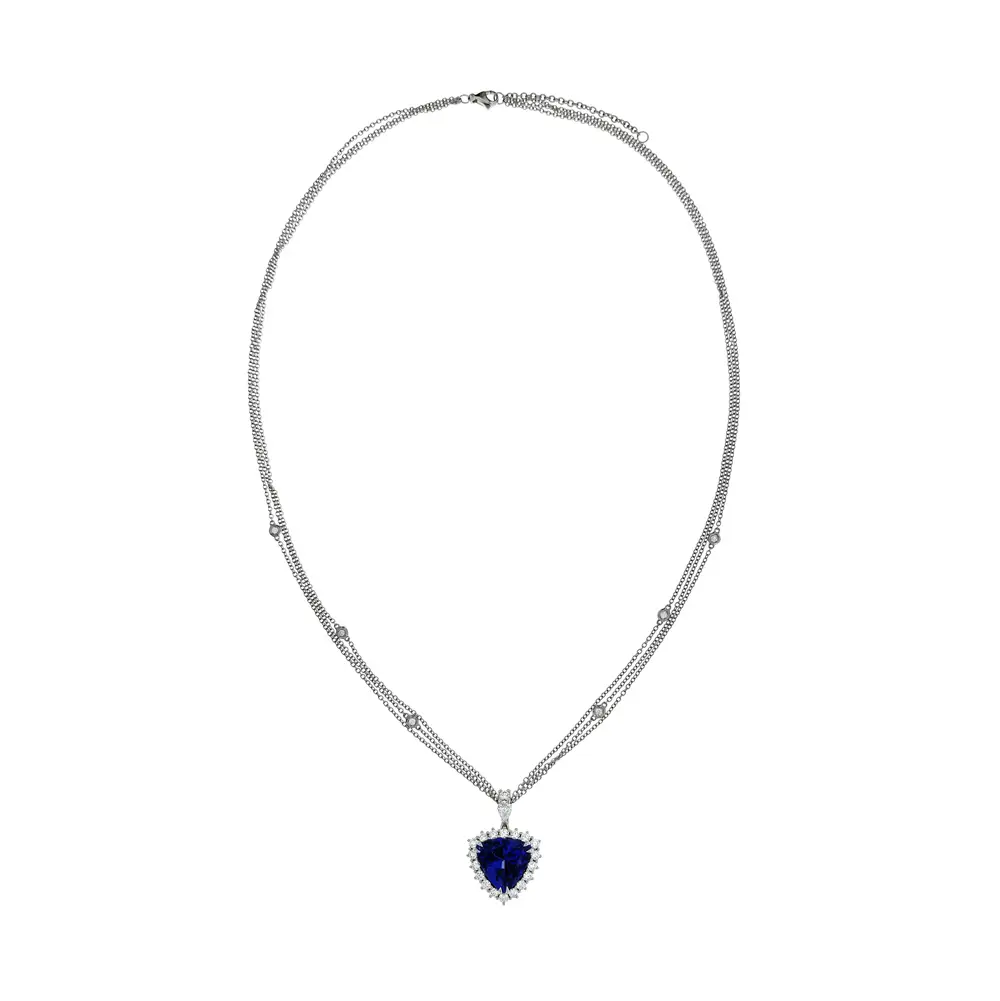 Im Mittelpunkt steht ein natürlicher Tansanit mit einem Gewicht von 7,54 ct, im Triliant-Schliff (12,50 × 12,50 mm), dessen tiefblaue Farbe Ruhe und Stärke symbolisiert. Ergänzt wird er durch 26 natürliche weiße Diamanten mit einem Gesamtgewicht von 1,28 ct, Farbe G, Reinheit VS — sie verleihen dem Schmuckstück einen unvergleichlichen Glanz.