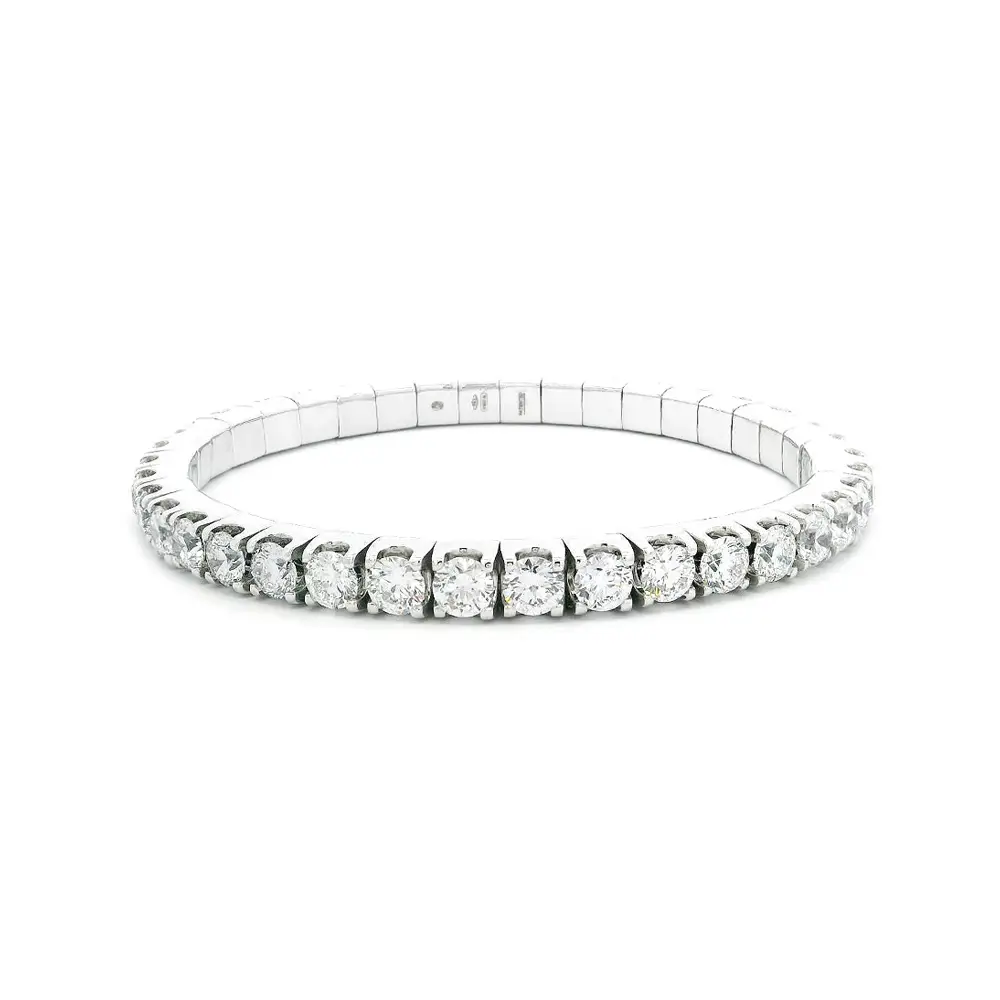 Das Armband ist mit 39 natürlichen Diamanten in runder Form besetzt, die zusammen 11,87 Karat wiegen. Jeder Stein misst 4,25 mm und erstrahlt in der Farbe G und Reinheit VS – ein Garant für außergewöhnlichen Glanz und Strahlkraft. Das Weißgold hebt das Feuer der Diamanten hervor und sorgt für ein faszinierendes Spiel von Licht und Eleganz.