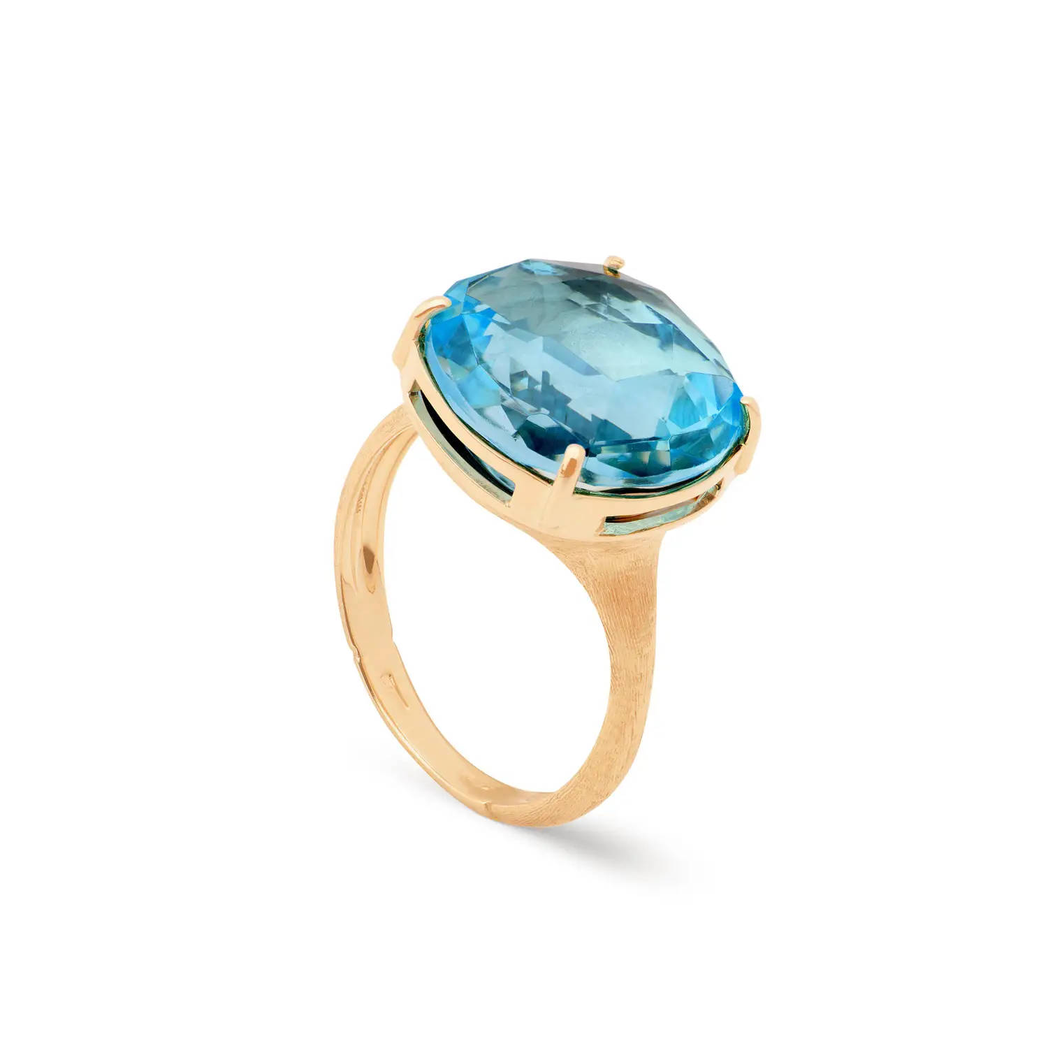 Die Ringschiene aus 18K Gelbgold ist mit Bulino-Handgravur versehen, die eine seidig matte, organische Struktur erzeugt. Diese rein handwerkliche Technik ist ein Markenzeichen von Marco Bicego und macht jedes Schmuckstück einzigartig. Das Design betont sowohl den Farbton des Topases als auch den satinierten Glanz des Goldes.
