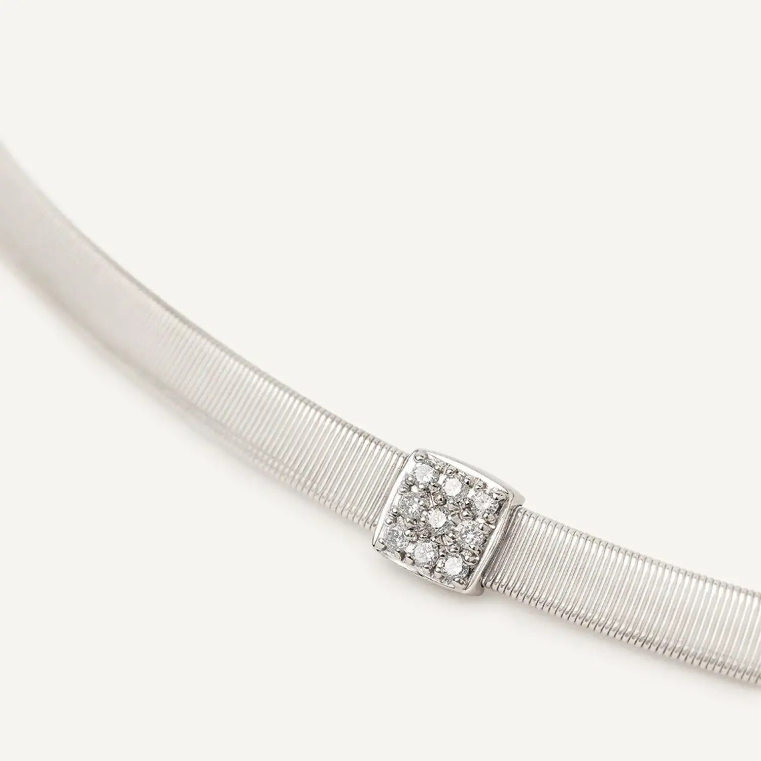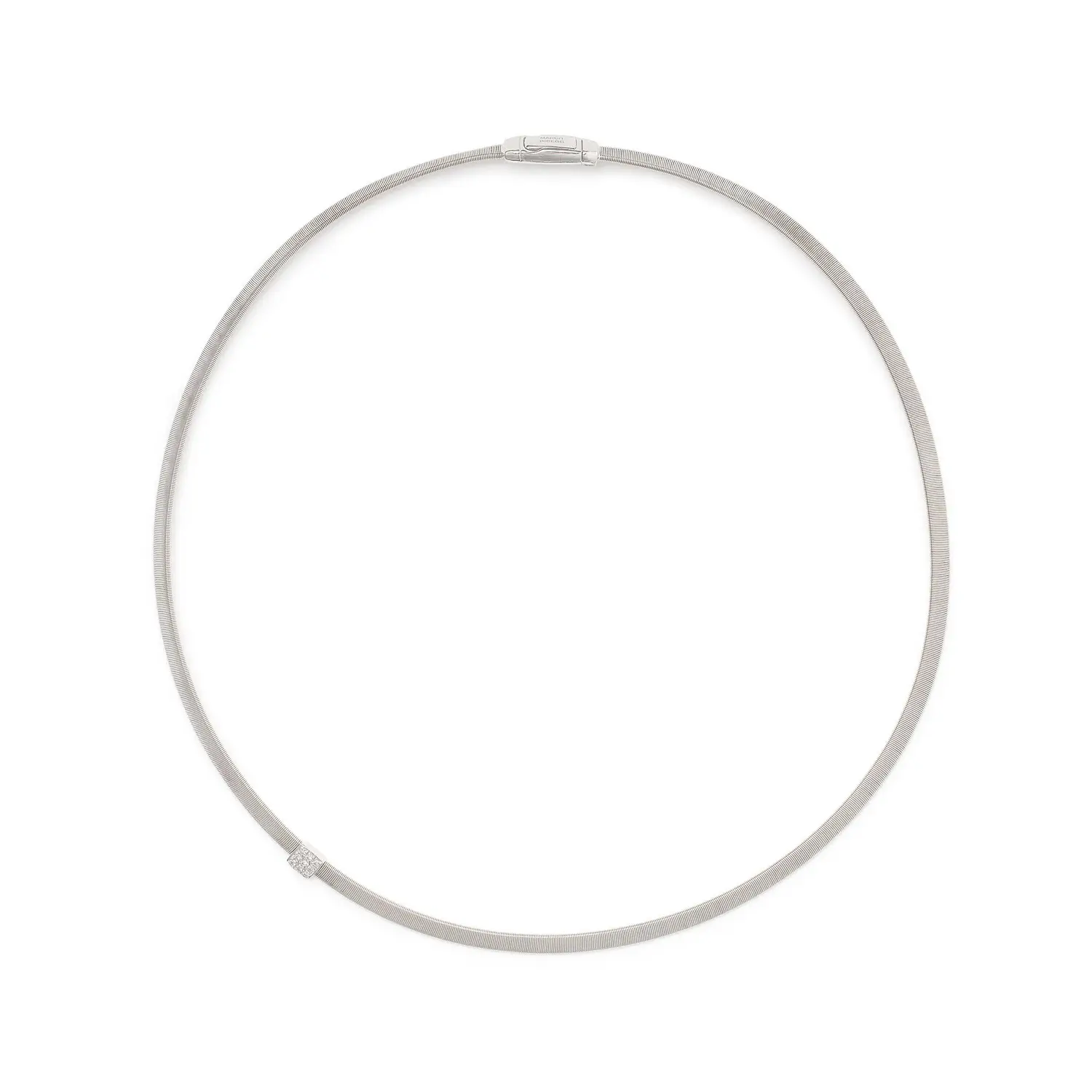 Diese elegante Halskette aus der Masai-Kollektion von Marco Bicego verkörpert modernen Minimalismus und italienische Raffinesse. Gefertigt aus 18 kt Weißgold und verziert mit einem Brillant-Pavé von ca. 0,07 ct, strahlt sie schlichte Eleganz und Luxus aus. Inspiriert von der afrikanischen Masai-Kultur spiegelt das Design Reinheit, Stärke und natürliche Anmut wider.