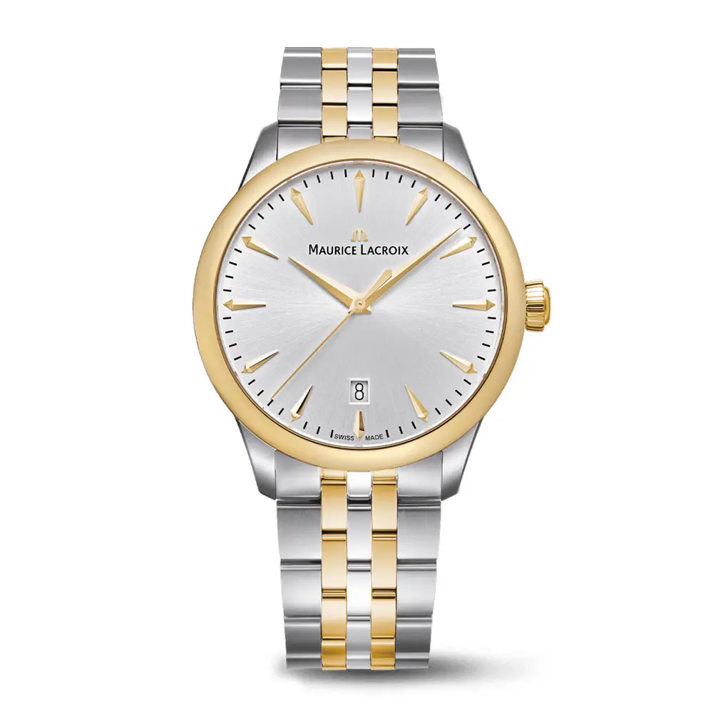 Die Maurice Lacroix 1975 Quartz Duotone 39mm (751007-PVY12-130-1) vereint klassische Linien mit Schweizer Uhrmacherkunst. Ihr 39 mm Edelstahlgehäuse mit 8,6 mm Höhe und PVD-Vergoldung verleiht der Uhr einen attraktiven Duotone-Look. Ein kratzfestes Saphirglas schützt das Zifferblatt und sorgt für dauerhafte Klarheit.
