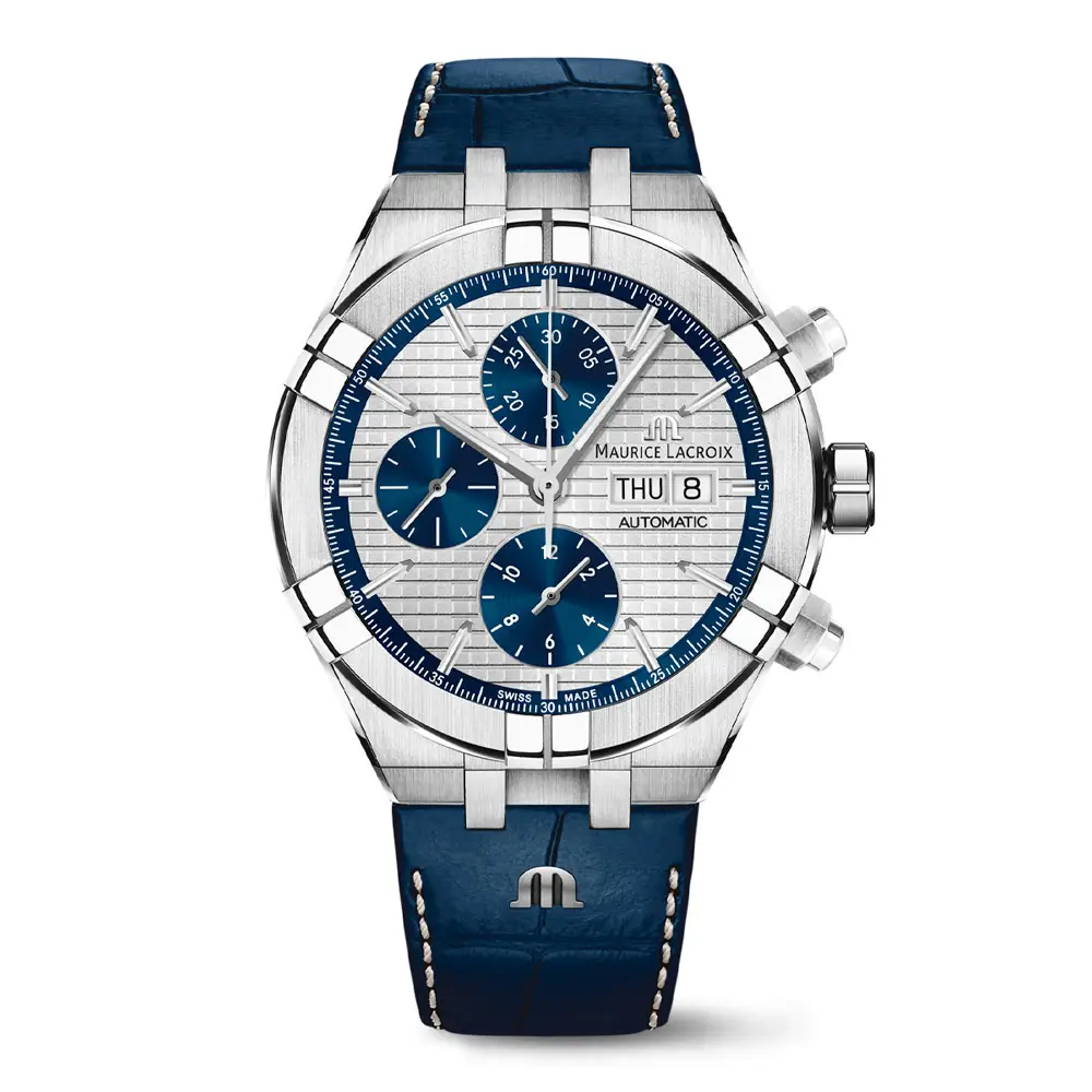 Mit blauem Lederarmband mit Faltschließe, entspiegeltem Saphirglas und Wasserdichtigkeit bis 200 m (20 bar) ist die Aikon Automatic Chronograph die perfekte Wahl für Herren, die Leistung, Eleganz und technische Raffinesse in modernem Design schätzen.