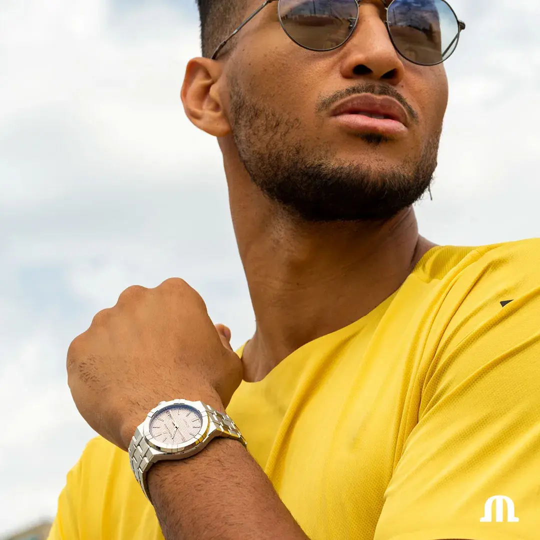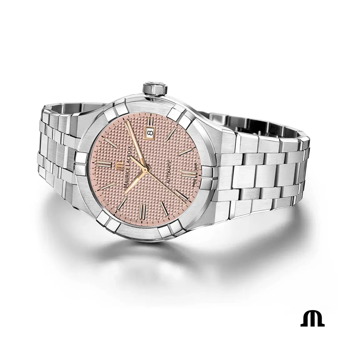 Aikon ist die Flaggschiff-Kollektion von Maurice Lacroix und verkörpert moderne sportliche Eleganz mit einer unverwechselbaren visuellen Identität. Sie ist vom ikonischen Modell Calypso aus den 1990er-Jahren inspiriert, wurde aber in einer zeitgemässen Form neu interpretiert, die sich durch klare Linien, architektonisches Design und ein integriertes Armband - eines der Hauptmerkmale der Kollektion - auszeichnet.