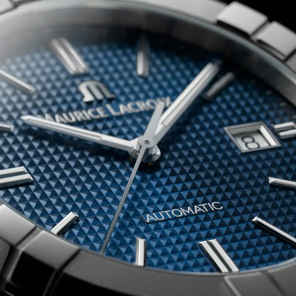 Aikon ist die Flaggschiff-Kollektion von Maurice Lacroix und verkörpert moderne sportliche Eleganz mit einer unverwechselbaren visuellen Identität. Sie ist vom ikonischen Modell Calypso aus den 1990er-Jahren inspiriert, wurde aber in einer zeitgemässen Form neu interpretiert, die sich durch klare Linien, architektonisches Design und ein integriertes Armband - eines der Hauptmerkmale der Kollektion - auszeichnet.