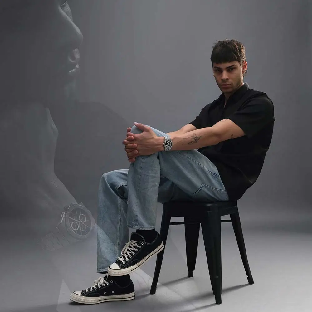 Das 42 mm Edelstahlgehäuse kombiniert satinierte und polierte Flächen und wird durch die charakteristische Lünette mit sechs Armen betont. Das schwarze Zifferblatt bietet starke Kontraste und hervorragende Ablesbarkeit – mit drei Chronographenzählern und einem Datumsfenster zwischen 4 und 5 Uhr, geschützt durch ein kratzfestes Saphirglas.