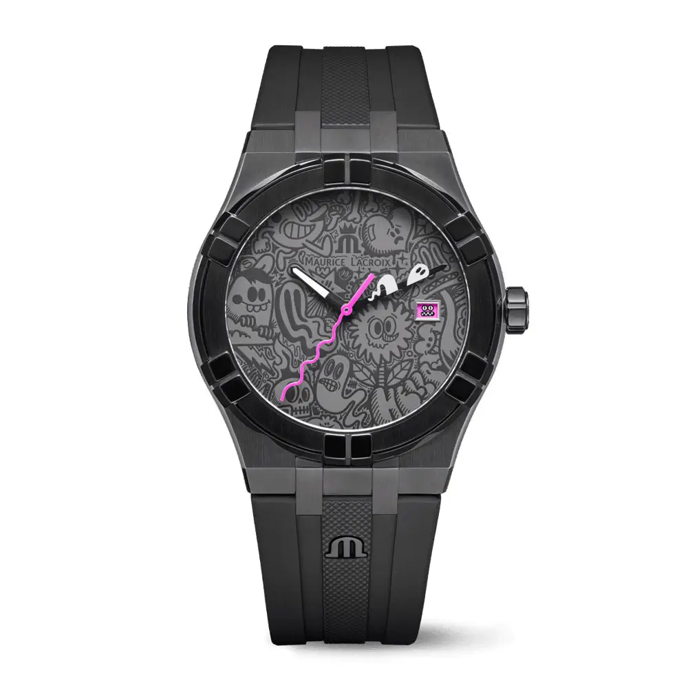 Maurice Lacroix AIKON Quartz WOTTO Limited Edition (AI1108-PVL20-090-2) ist ein exklusives Modell, limitiert auf 500 Stück. Es verbindet die Präzision eines Schweizer Quarzwerks mit dem markanten Street-Art-Design von WOTTO. Das 40 mm Edelstahlgehäuse wird durch ein kratzfestes Saphirglas und eine verschraubte Krone ergänzt.