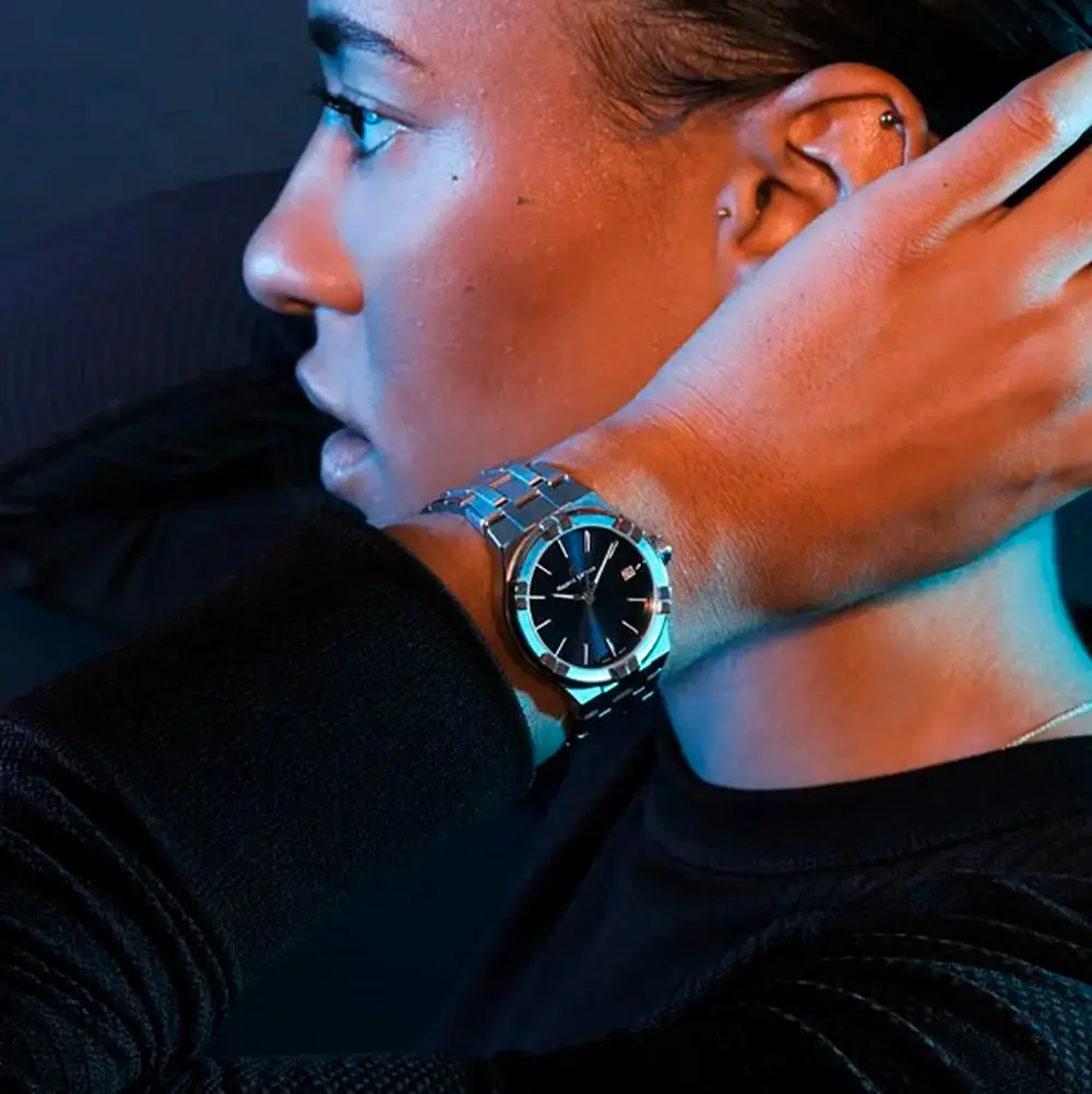 Aikon ist die Flaggschiff-Kollektion von Maurice Lacroix und verkörpert moderne sportliche Eleganz mit einer unverwechselbaren visuellen Identität. Sie ist vom ikonischen Modell Calypso aus den 1990er-Jahren inspiriert, wurde aber in einer zeitgemässen Form neu interpretiert, die sich durch klare Linien, architektonisches Design und ein integriertes Armband - eines der Hauptmerkmale der Kollektion - auszeichnet.