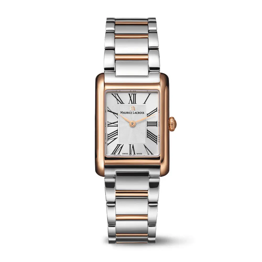 Die Maurice Lacroix Fiaba Square FA1205-PVP02-110-A ist eine elegante Damenuhr, die feine Linien, Schweizer Präzision und ein raffiniertes zweifarbiges Design vereint. Das rechteckige Gehäuse mit den Maßen 24×34 mm ist aus poliertem Stahl gefertigt und mit einer roségoldenen PVD-Beschichtung veredelt, die dem Modell ein luxuriöses Aussehen verleiht. Dank ihrer Höhe von nur 6,5 mm wirkt die Uhr äußerst dezent.