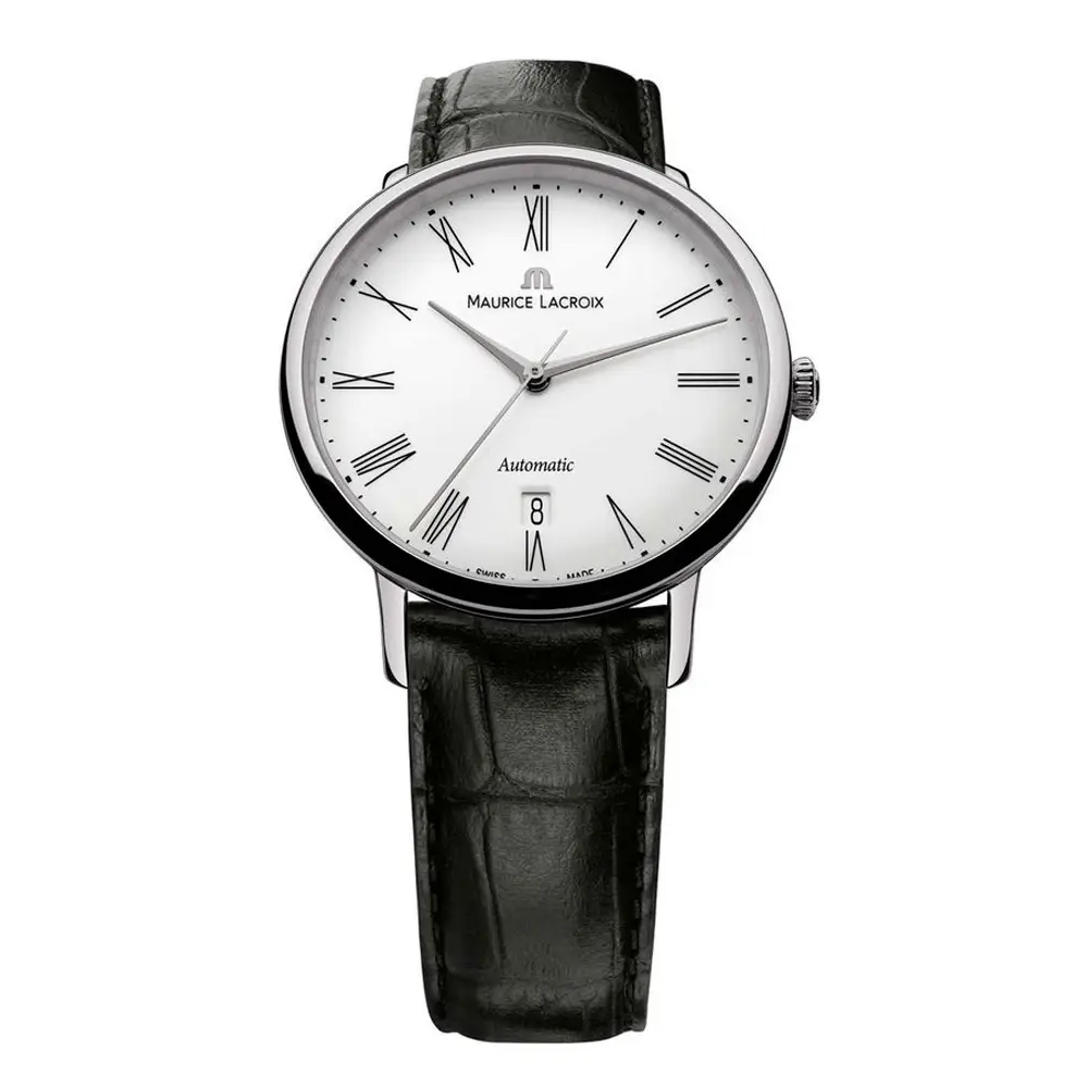 Das Modell Les Classiques Tradition von Maurice Lacroix verkörpert klassische Ästhetik und meisterhafte Handwerkskunst. Das runde 38-mm-Gehäuse aus Edelstahl ist perfekt ausbalanciert für den täglichen Gebrauch und dennoch elegant genug für festliche Anlässe. Saphirglas sorgt für hohe Kratzfestigkeit und schützt das elegante weiße Zifferblatt, auf dem schlanke Zeiger und eine dezente Datumsanzeige bei 3 Uhr dominieren.