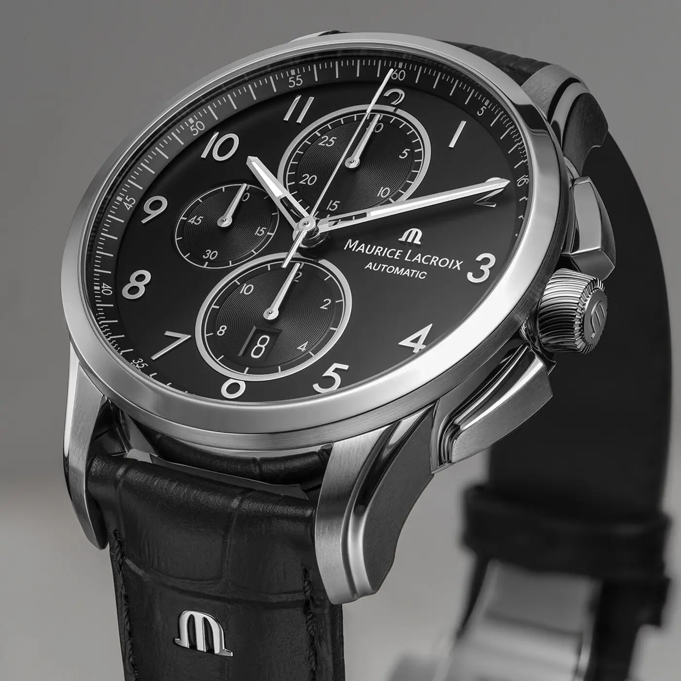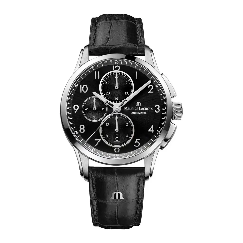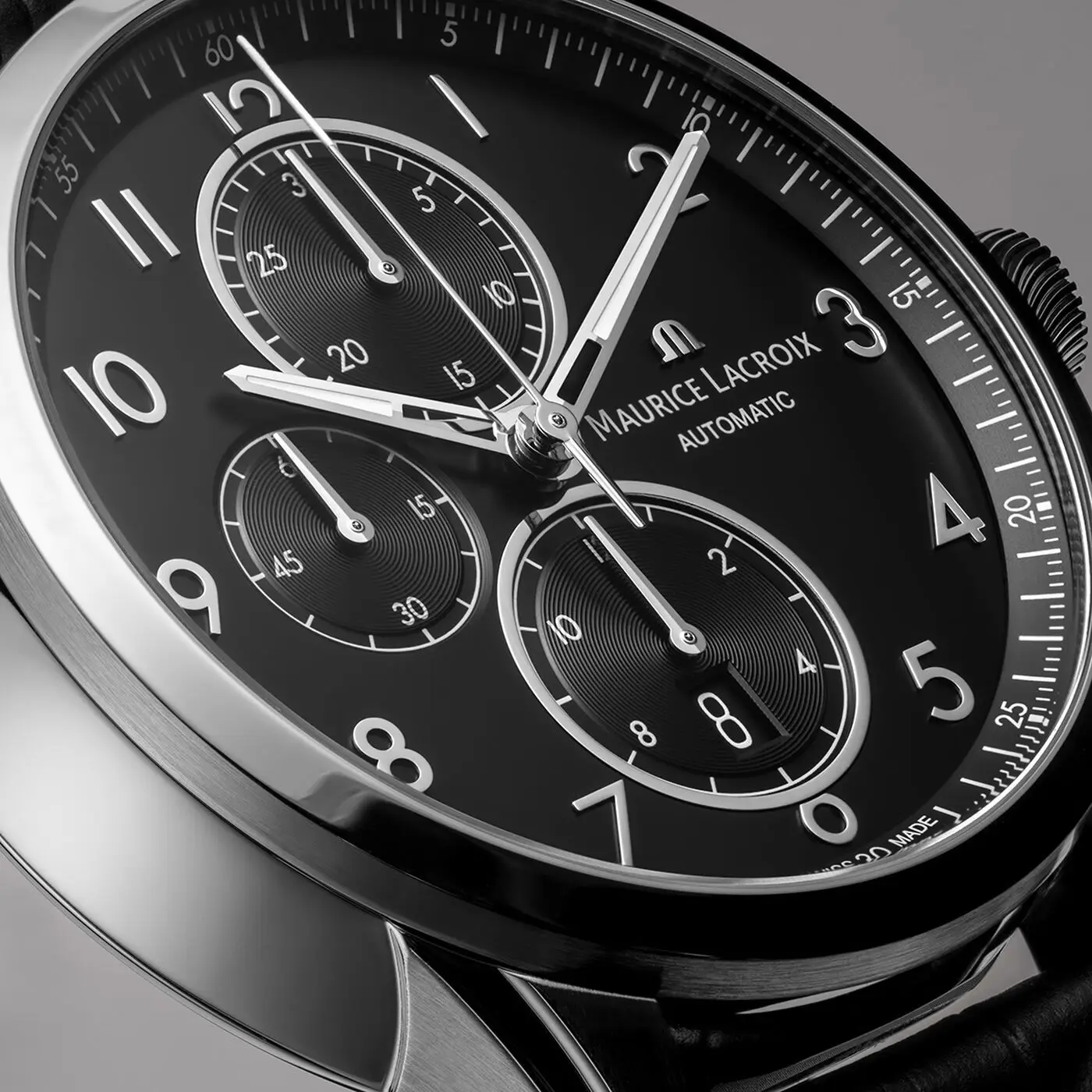 Černý strukturovaný ciferník s třemi subčíselníky a stříbrnými luminiscenčními ručkami zajišťuje výbornou čitelnost. Uvnitř pracuje automatický kalibr ML112 s funkcemi chronografu, dne a data, frekvencí 28 800 vib/h a rezervou chodu 48 hodin.
