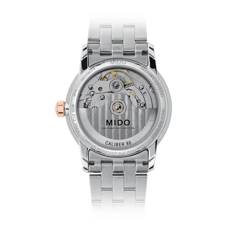Die Marke Mido hat sich eine starke Identität geschaffen, indem sie die traditionelle Schweizer Uhrmacherkunst mit Inspirationen aus der Architektur verbindet. Die Kollektionen orientieren sich oft an ikonischen Gebäuden aus der ganzen Welt, was sich in ihrem Design, ihren Proportionen und ihrer Ästhetik widerspiegelt. Mido hat sich auf mechanische Uhren mit zuverlässigen Automatikwerken spezialisiert, die oft über eine lange Gangreserve von bis zu 80 Stunden verfügen (Kaliber Powermatic 80).