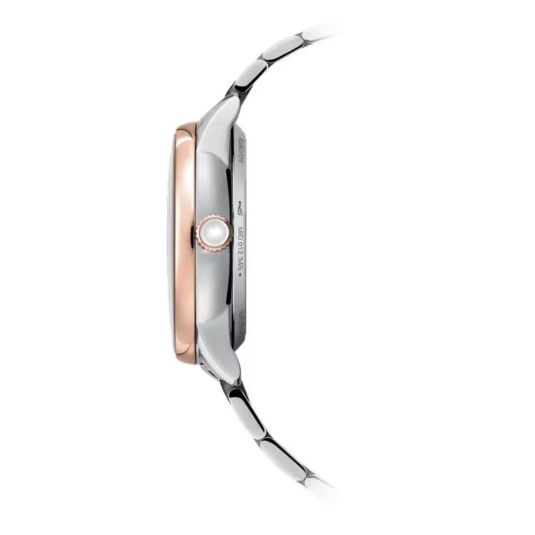 Die Mido Baroncelli Lady Necklace ist ein elegantes Schmuckstück fürs Handgelenk, das feines Design, luxuriöse Details und Schweizer Präzision vereint. Das anspruchsvolle runde Gehäuse mit einem Durchmesser von 33 mm besteht aus hochwertigem Edelstahl und ist mit roségoldfarbenen Details, einschließlich der Lünette, versehen, was der Uhr einen modernen und femininen Charakter verleiht.