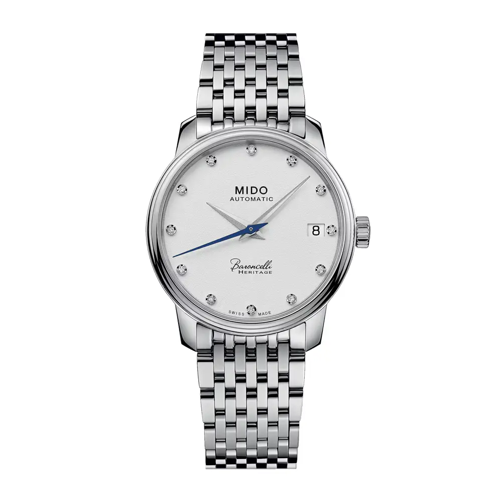 Die Mido Baroncelli Heritage Lady ist ein elegantes Damenmodell, das klassischen Stil, dezente Details und Schweizer Präzision vereint. Das runde Gehäuse mit einem Durchmesser von 33 mm besteht aus hochwertigem Edelstahl und wird durch ein robustes Saphirglas geschützt, das hervorragenden Schutz und gute Ablesbarkeit gewährleistet.