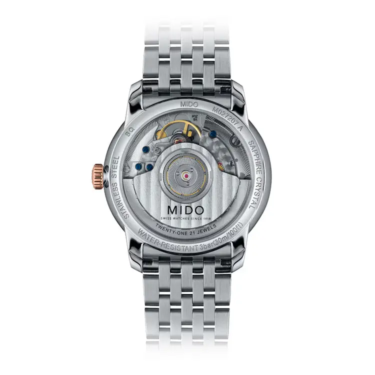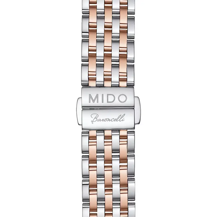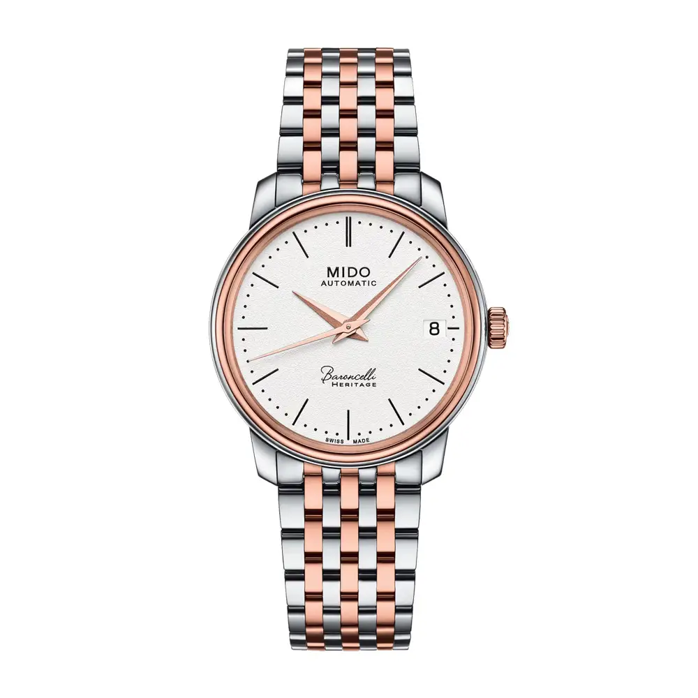 Die Mido Baroncelli Heritage Lady ist ein elegantes und zeitloses Damenmodell, das Schweizer Präzision mit feiner Ästhetik verbindet. Das runde Gehäuse mit einem Durchmesser von 33 mm besteht aus hochwertigem Edelstahl, ergänzt durch roségoldfarbene Details, auch an der Lünette, was der Uhr einen anspruchsvollen und modernen Look verleiht.
