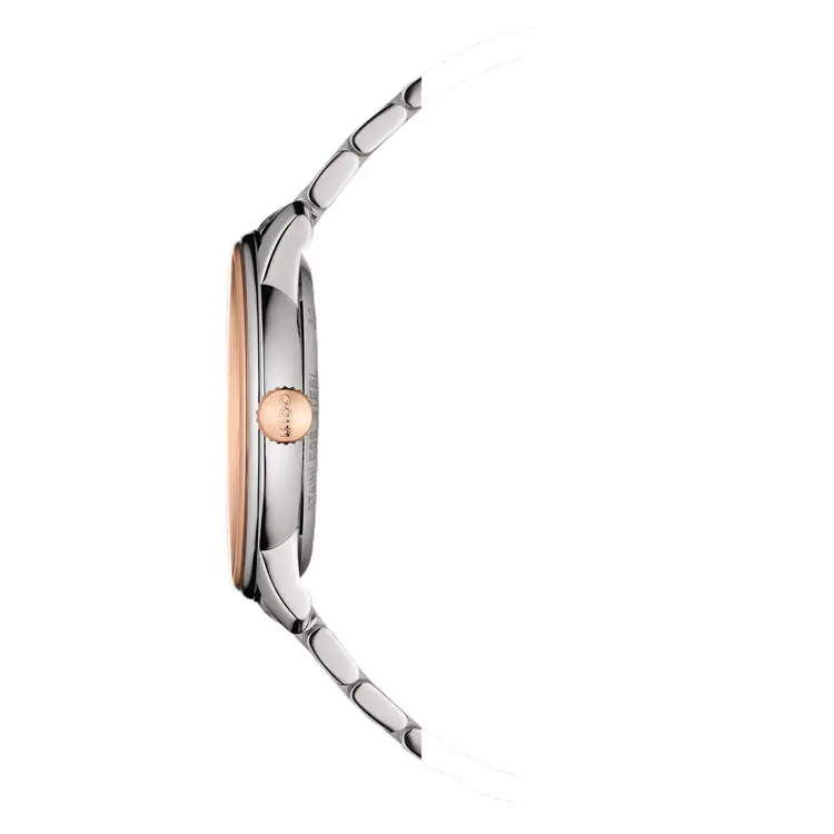 Das elegante bicolor Edelstahlarmband mit roségoldfarbenen Akzenten und komfortabler Faltschließe unterstreicht den luxuriösen Charakter der Uhr und sorgt für angenehmen Tragekomfort. Dank der Wasserdichtigkeit von 3 ATM (30 Meter) eignet sich die Uhr für den täglichen Gebrauch unter normalen Bedingungen.