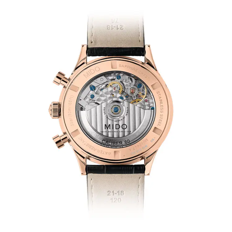 Die Mido Multifort Patrimony Chronograph ist die elegante Verbindung von klassischem Stil, feinen Details und Schweizer Uhrmacherqualität. Das runde Gehäuse mit einem Durchmesser von 42 mm besteht aus Stahl mit roségoldfarbener PVD-Beschichtung, was der Uhr einen anspruchsvollen und luxuriösen Look verleiht. Das robuste Saphirglas sorgt für perfekten Schutz des Zifferblatts und hervorragende Ablesbarkeit.