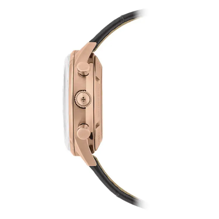 Abgerundet wird die Uhr durch ein elegantes schwarzes Lederarmband mit klassischer Dornschließe, das für komfortables und sicheres Tragen sorgt. Dank der Wasserdichtigkeit von 5 ATM (50 Meter) eignet sie sich für den täglichen Gebrauch und gelegentlichen Wasserkontakt.