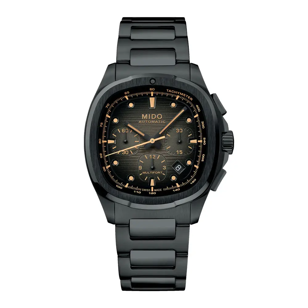 Das stilvolle graue, horizontal gebürstete Zifferblatt wird durch ein schwarzes Stahlarmband mit PVD-Beschichtung und eine Faltschließe mit Drückern für einen sicheren und komfortablen Verschluss ergänzt. Der Mido Multifort TV Chronograph vereint sportliche Eleganz, moderne Technik und robustes Design, das Liebhaber von markanten und zugleich funktionalen Uhren zu schätzen wissen werden.